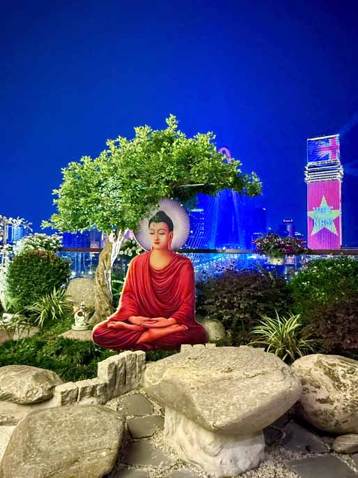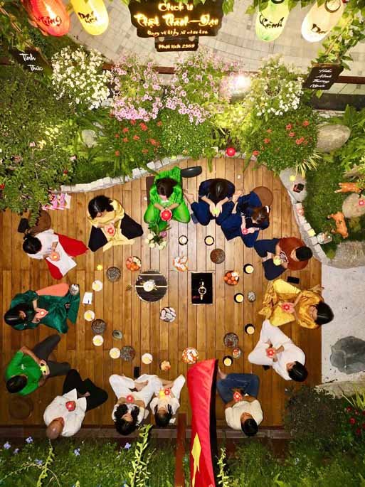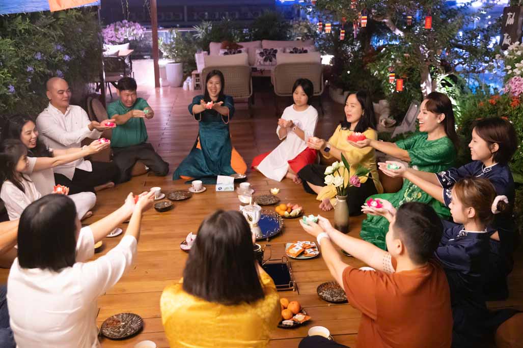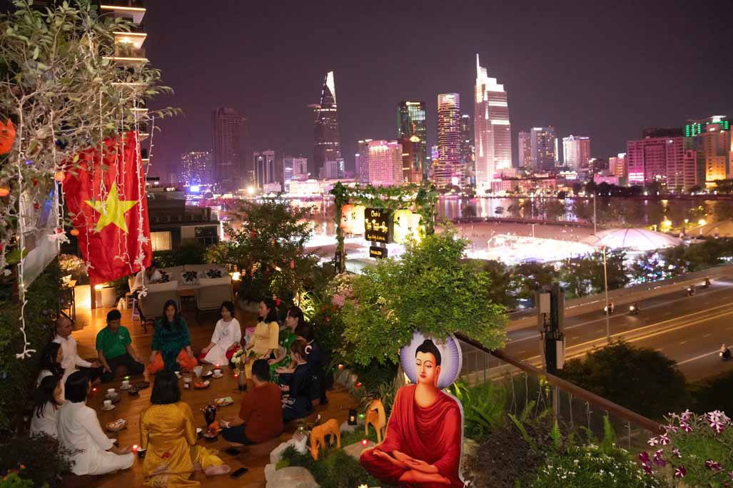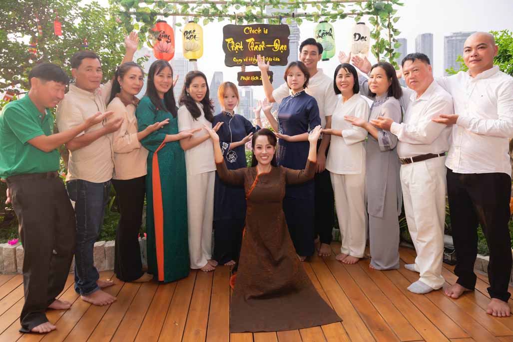 Ngoài phần tụng niệm và đọc thời kinh, buổi lễ còn có không gian trà đạo, một hoạt động mang tính tĩnh lặng, giúp người tham dự an trú tâm, lắng nghe và trao đổi về tu tập. Những cuộc trao đổi, chia sẻ Phật pháp giữa các đạo hữu và khách mời diễn ra một cách thân mật, hướng về tinh thần hoan hỷ, hoà hợp và ứng dụng lời Phật dạy trong đời sống gia đình, công việc.