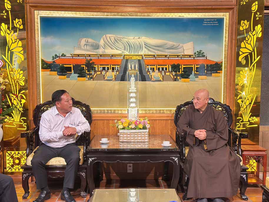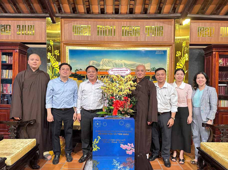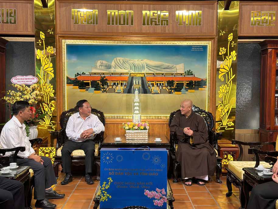Phái đoàn do ông Ông Nguyễn Khánh Toàn – Phó Giám đốc Sở Dân tộc và Tôn giáo Thành phố Hồ Chí Minh làm Trưởng đoàn, cùng các thành viên tháp tùng đã đến Tổ đình Hội Khánh (số 29 phường Thủ Dầu Một, TP.HCM) thăm và gửi lời chúc mừng năm mới đến HT. Thích Huệ Thông. Thân mật đón tiếp đoàn có: HT. Thích Huệ Thông – Phó Chủ tịch HĐTS, Trưởng ban Pháp chế T.Ư, Cố vấn Ban Trị sự PG TP.HCM, Trụ trì Tổ đình Hội Khánh; ĐĐ. Thích Huệ Nghiêm – Phó Thư ký BTS PG TP.HCM, phụ trách Văn phòng Ban Trị sự PG khu vực Bình Dương (cũ).