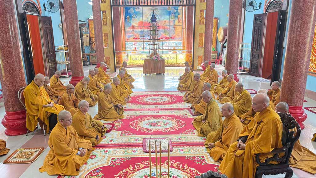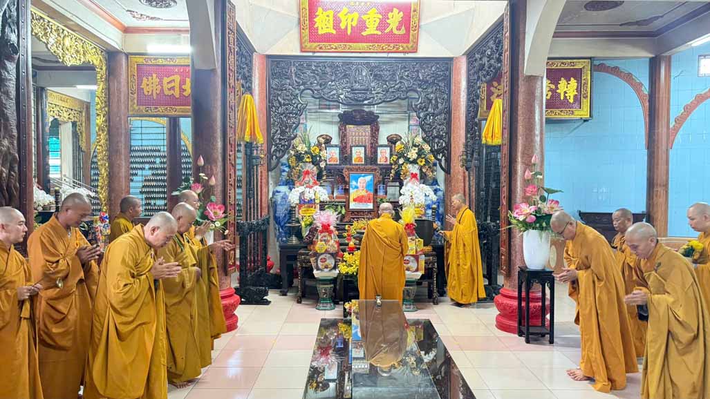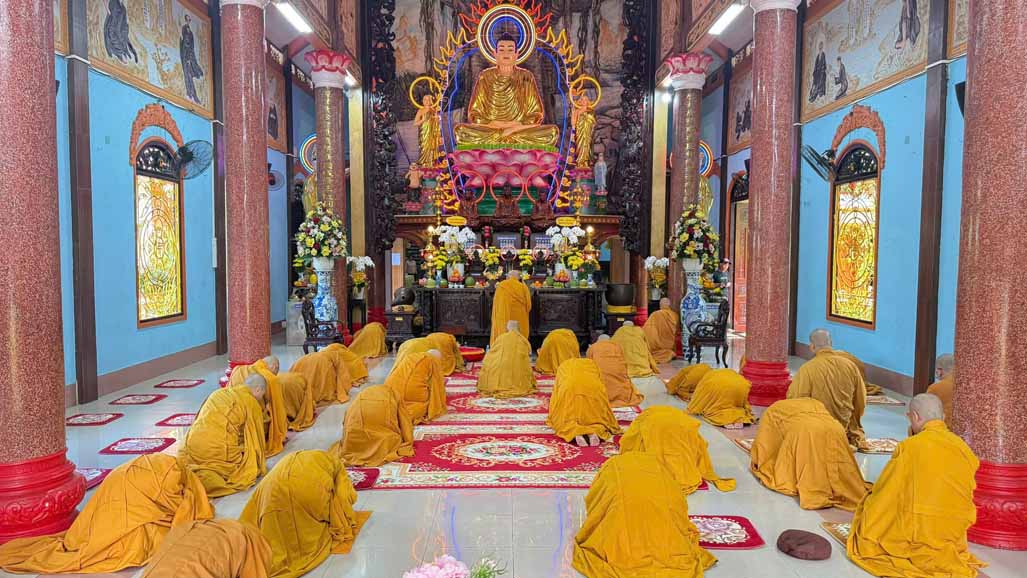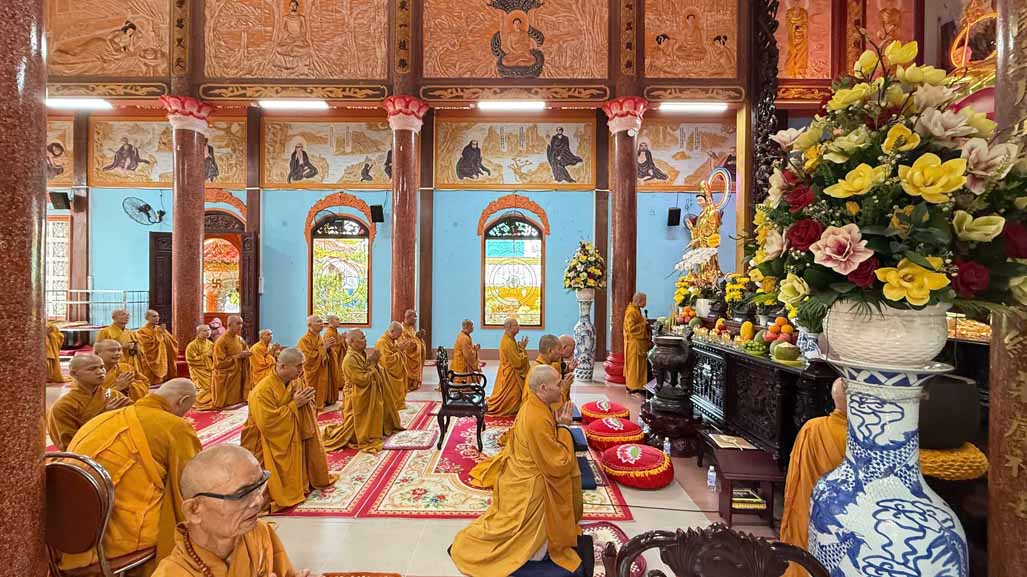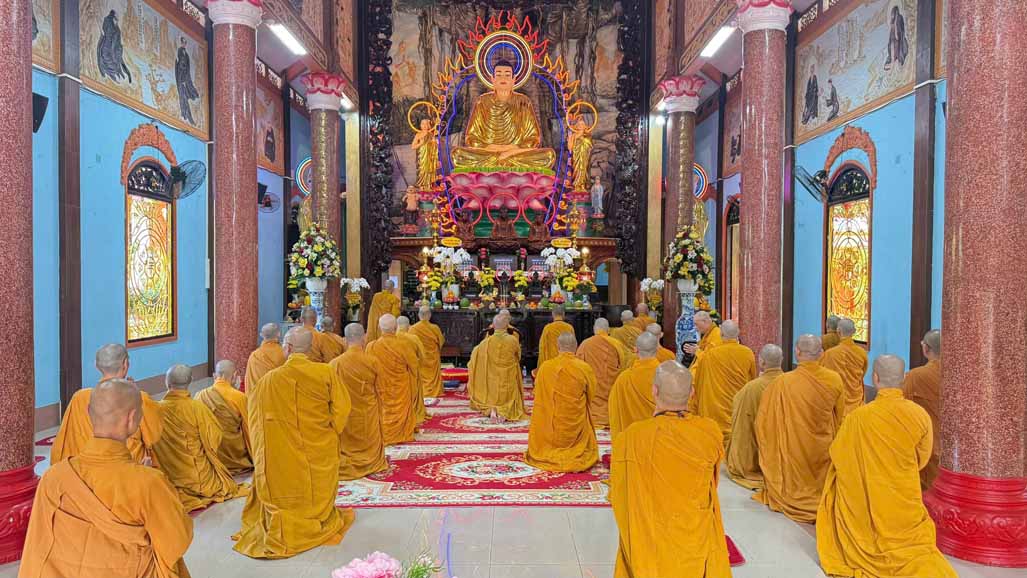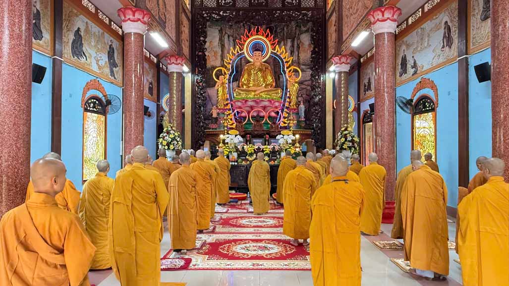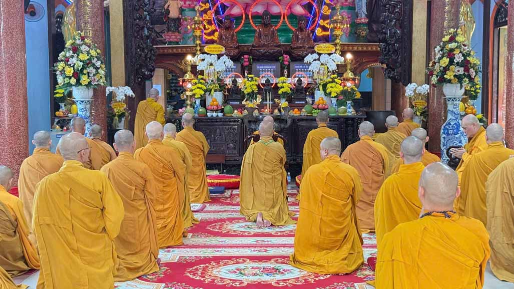 Sáng ngày 25 tháng 07 năm 2025 (1/ 6/ Ất Tỵ), chư Tôn đức Tăng Trường hạ Tổ đình Vạn Thọ (247 Hoàng Sa, P. Tân Định, TP. HCM) đã vân tập tại Đại hùng bảo điện thực hiện lễ Bố-tát trì tụng luật Tỳ kheo giới kinh.