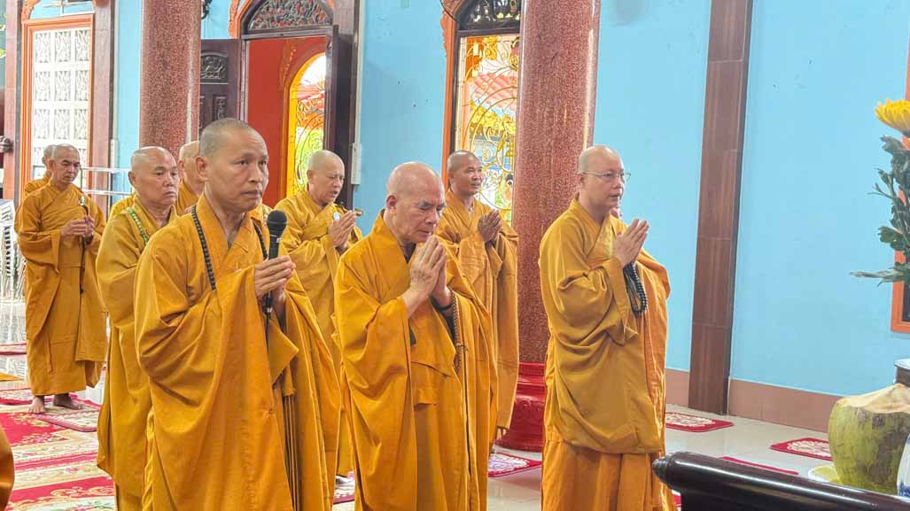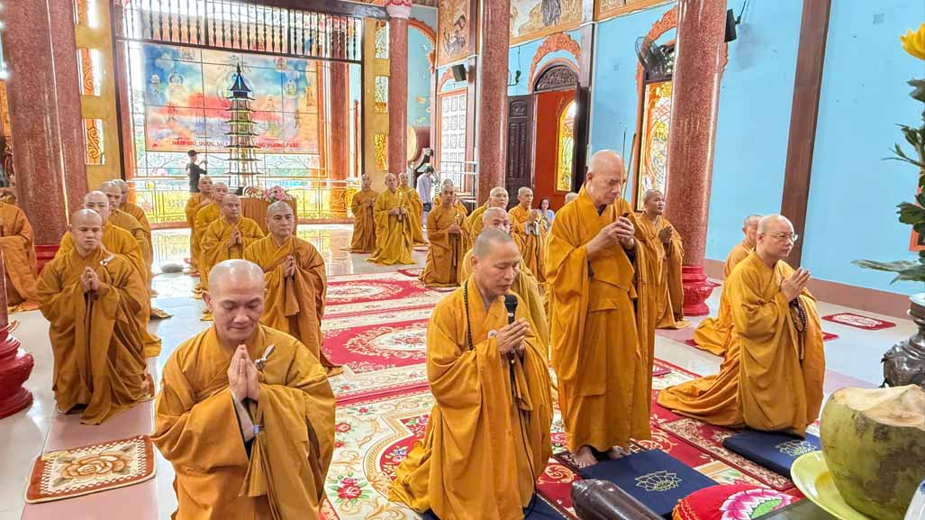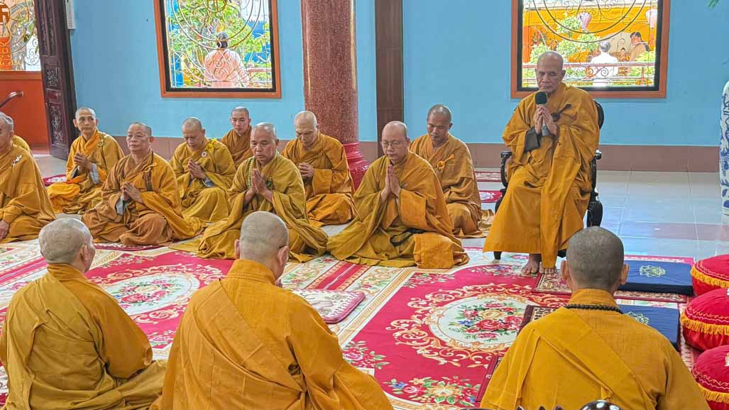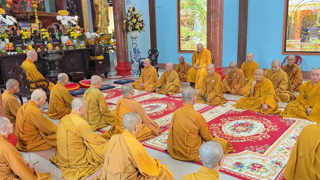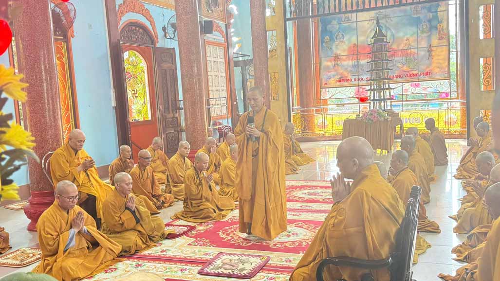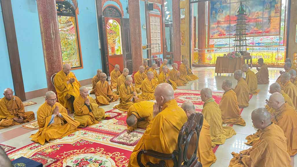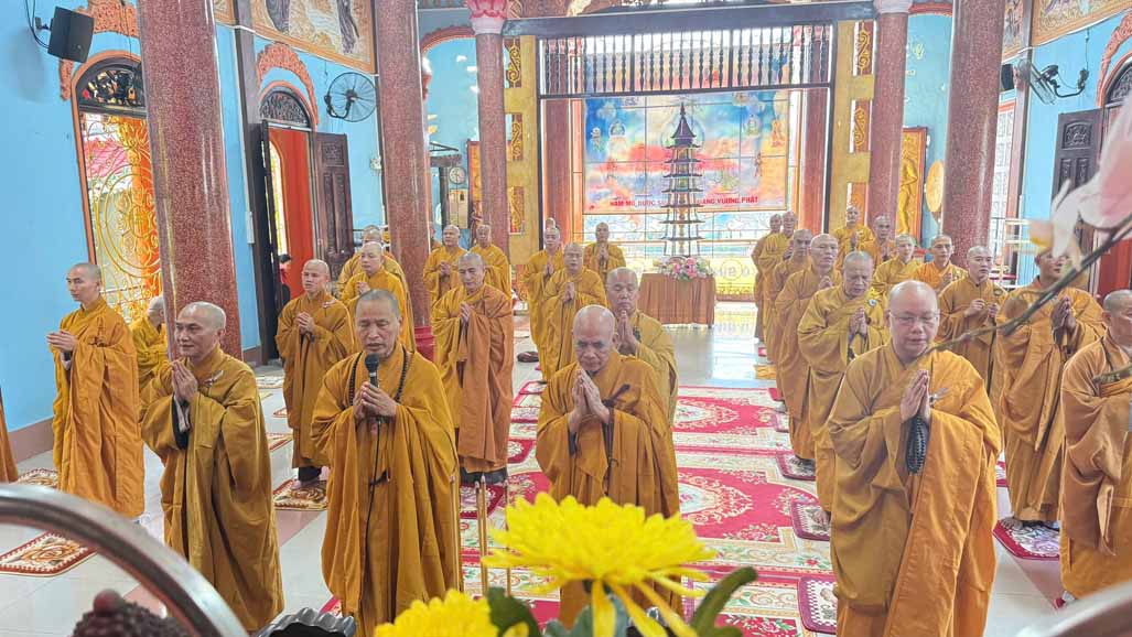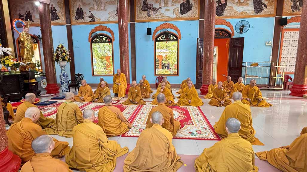 Sáng ngày 25 tháng 07 năm 2025 (1/ 6/ Ất Tỵ), chư Tôn đức Tăng Trường hạ Tổ đình Vạn Thọ (247 Hoàng Sa, P. Tân Định, TP. HCM) đã vân tập tại Đại hùng bảo điện thực hiện lễ Bố-tát trì tụng luật Tỳ kheo giới kinh.