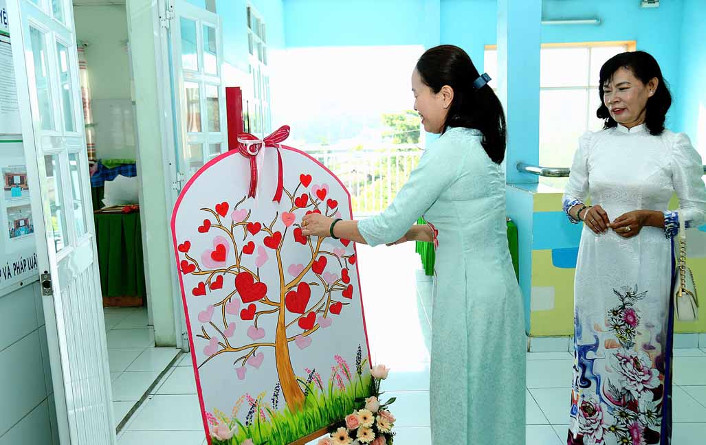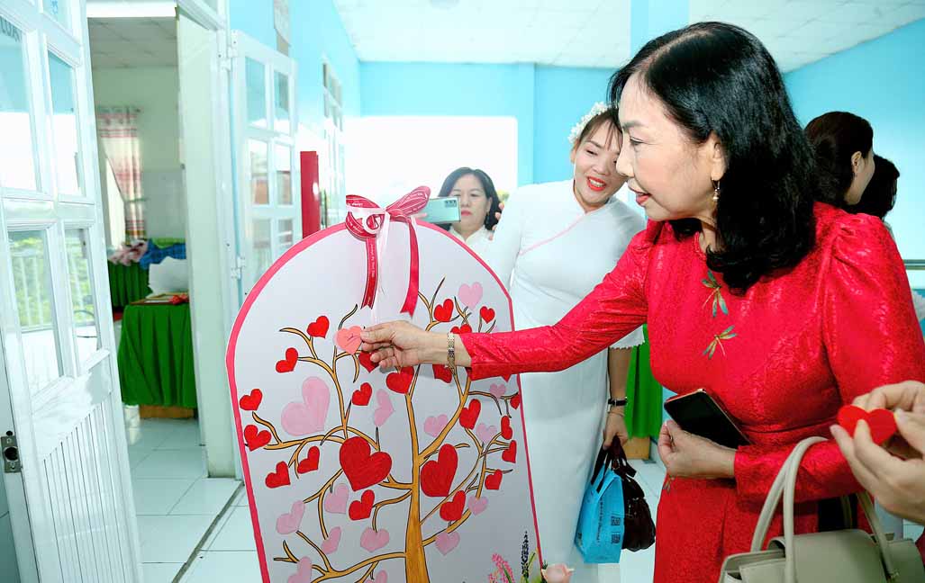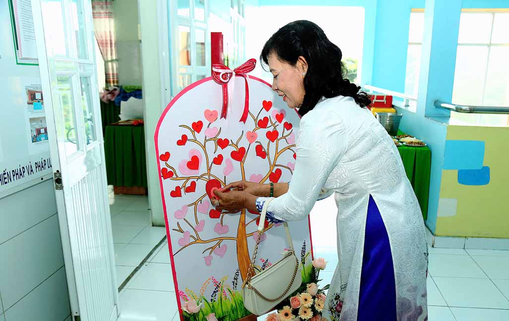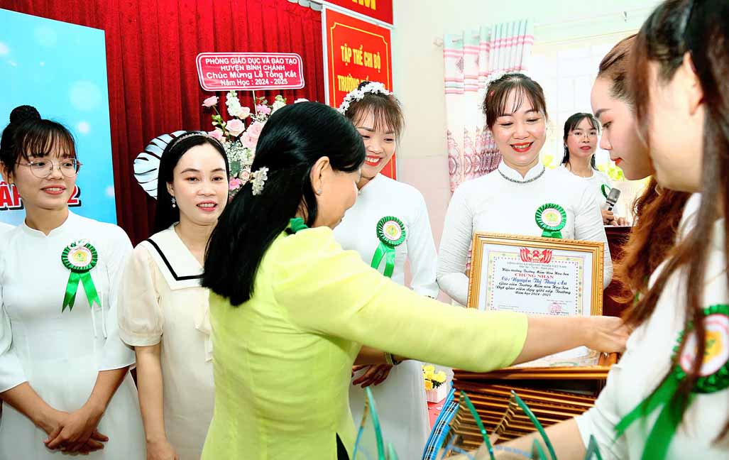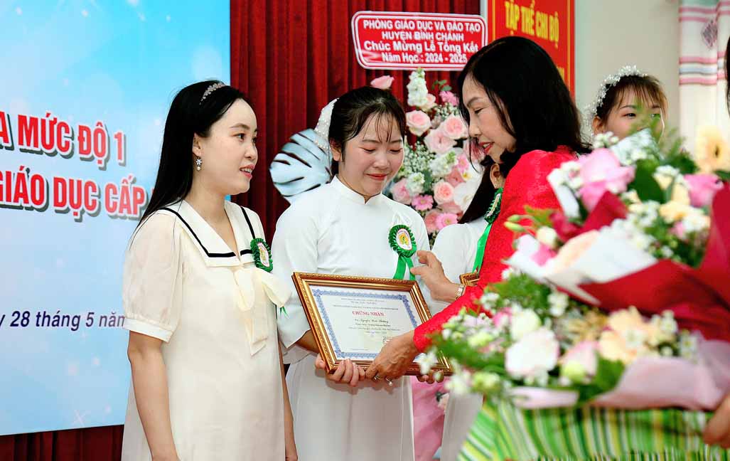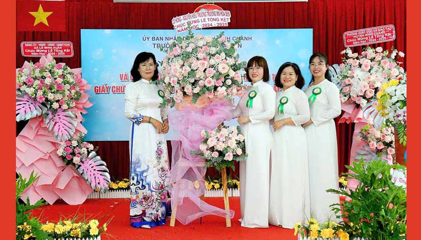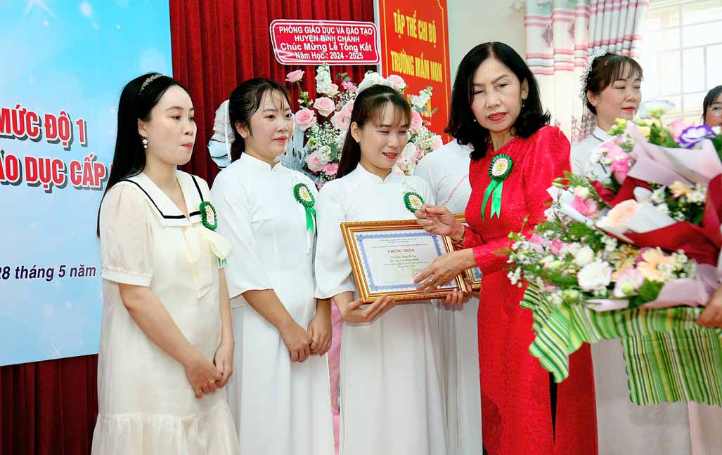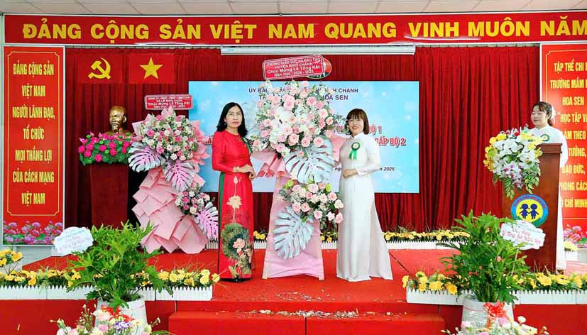 Bà Nguyễn Thị Liêm – Huyện ủy viên, Bí thư Đảng ủy xã Lê Minh Xuân trao Bằng công nhận của Giám đốc Sở Giáo dục và Đào tạo Thành phố Hồ Chí Minh về công nhận Trường Mầm non Hoa Sen, huyện Bình Chánh đạt Chuẩn Quốc gia mức độ 1, đạt kiểm định chất lượng giáo dục cấp độ 2.