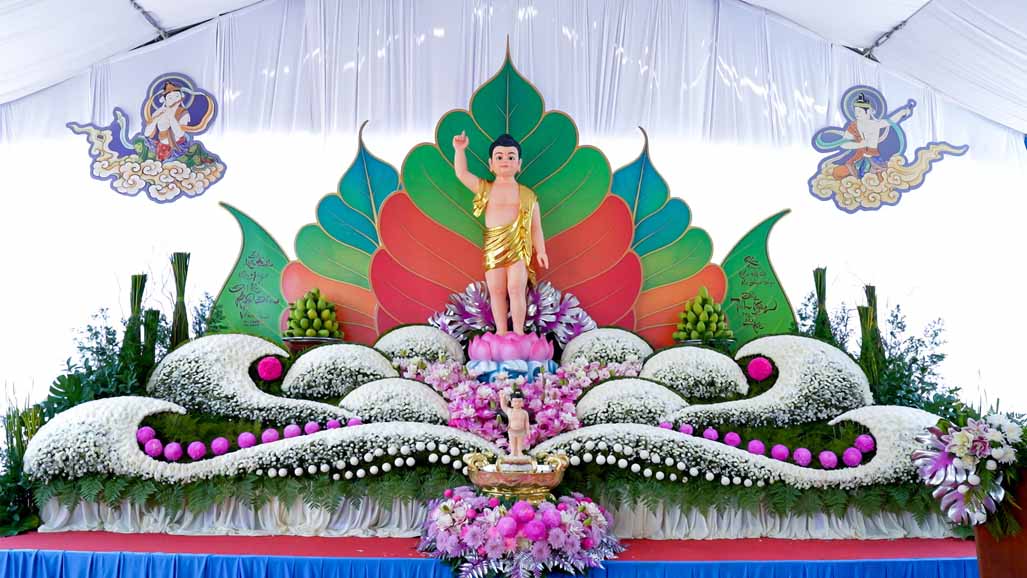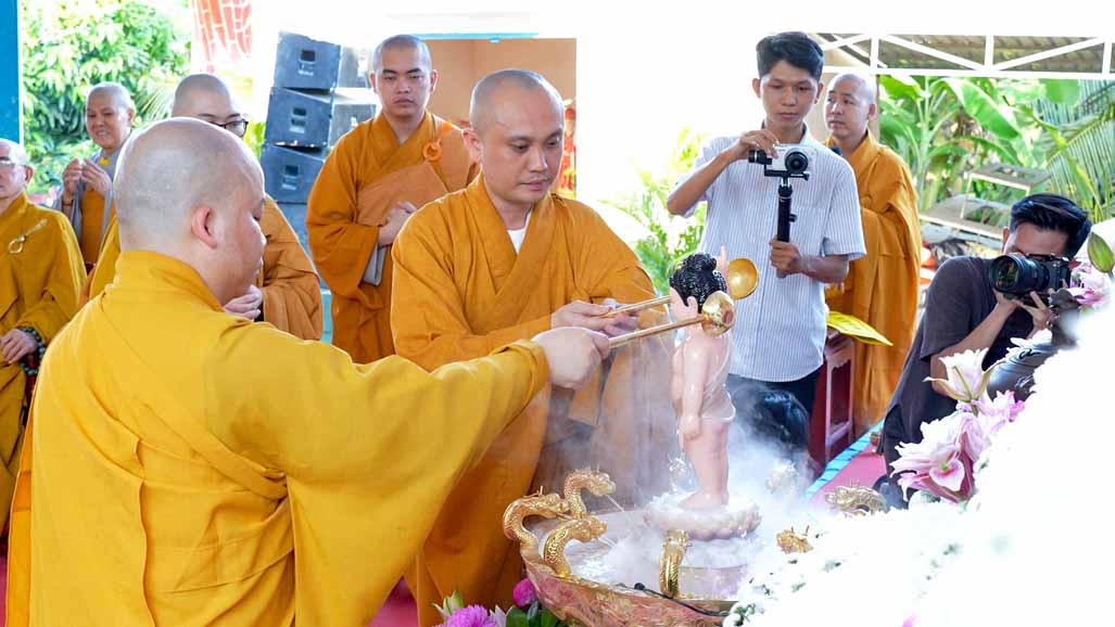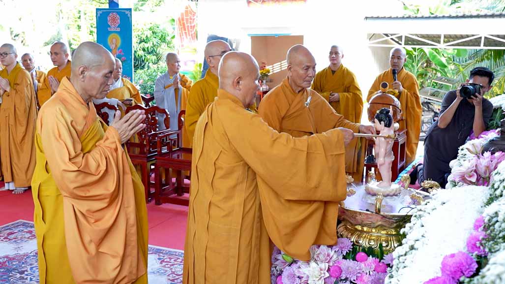 ĐĐ. Thích Đức Trung mang theo tâm thành của toàn thể hội chúng đảnh lễ cuộc đời Đức Phật. Ban Nghi lễ xướng lễ tụng Kinh Khánh Đản và truy tán công đức Như Lai, chư Tôn Hoà thượng chứng minh, Tăng Ni, Phật tử tham dự lần lượt thực hiện nghi thức tắm Phật.