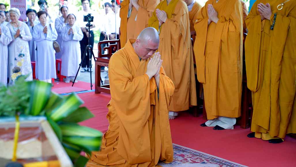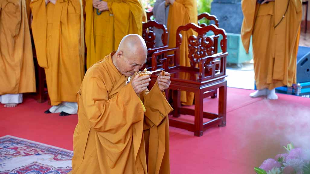 Tiếp đó, trong không gian thanh tịnh, giờ phút thiêng liêng chuông trống Bát-nhã vang lên trầm hùng, HT.Thích Thiện Thanh trang nghiêm niệm hương cúng dường, đảnh lễ kim thân Đức Phật; đại chúng hướng về Lễ đài nơi tôn trí kim thân Đức Phật bày tỏ lòng tôn kính vô biên đối với bậc điều ngự trượng phu, thiên nhơn sư, Phật-Thế Tôn.