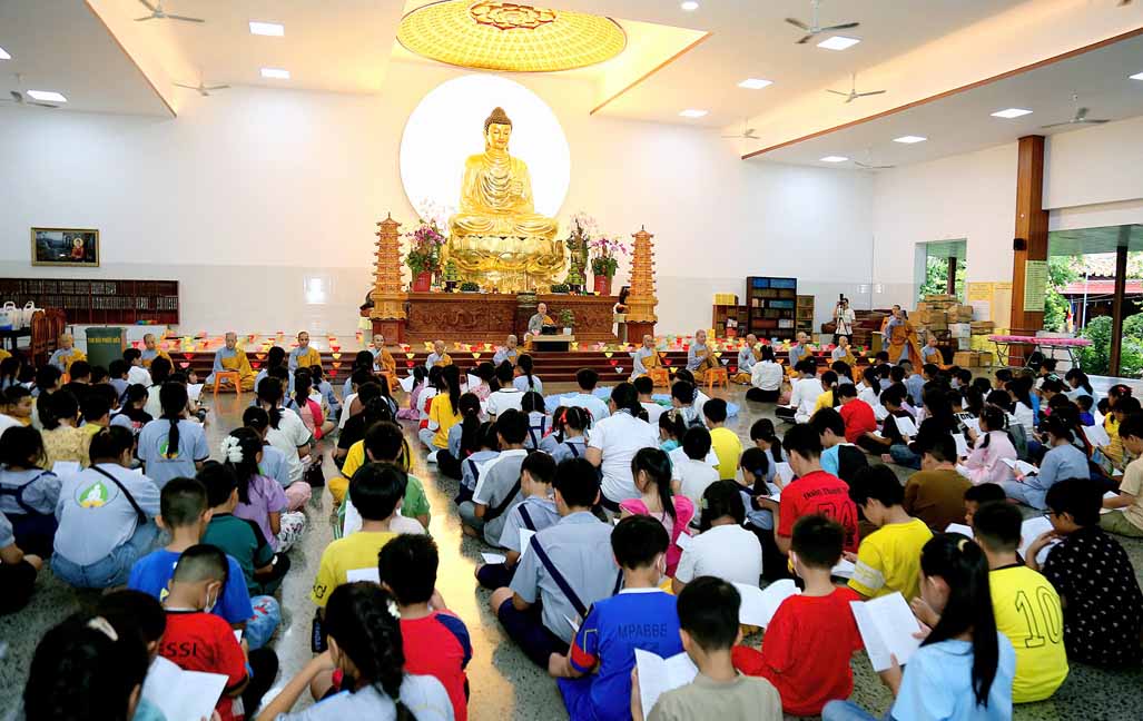 Chương trình được sự hướng dẫn của Ni sư Thích Diệu Hiếu cùng quý Sư cô tại Tu viện, các bé được tham dự nghi thức tụng kinh và thắp nến hoa đăng để gieo duyên lành với Phật pháp từ khi còn nhỏ.