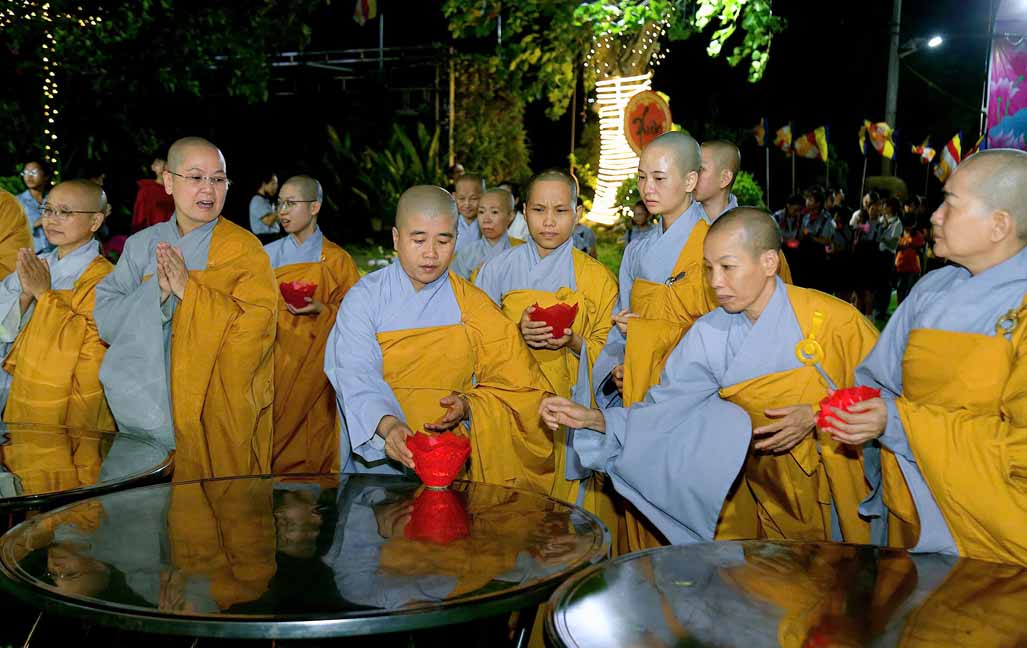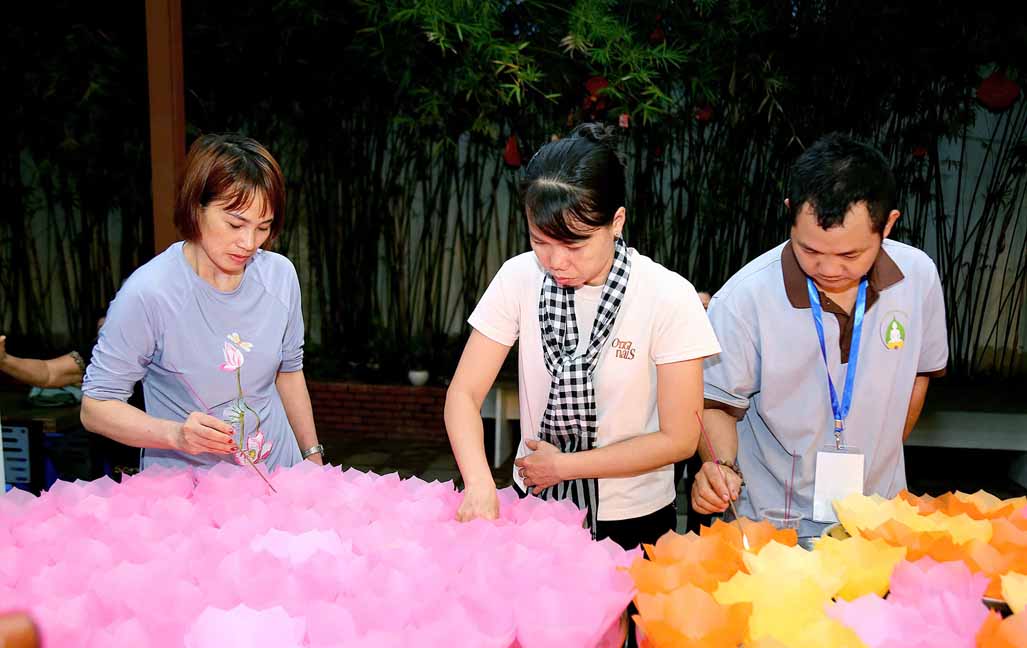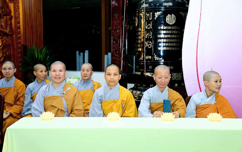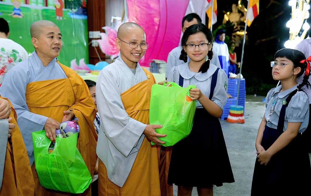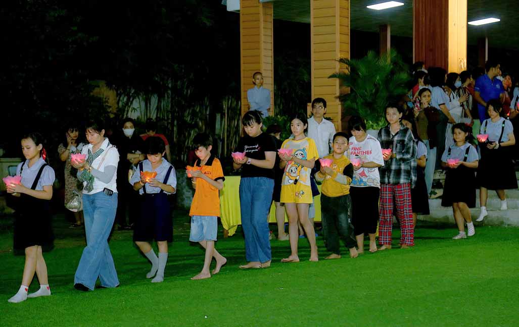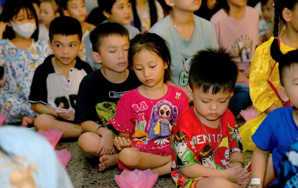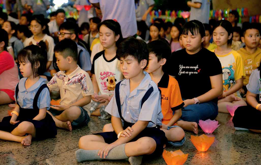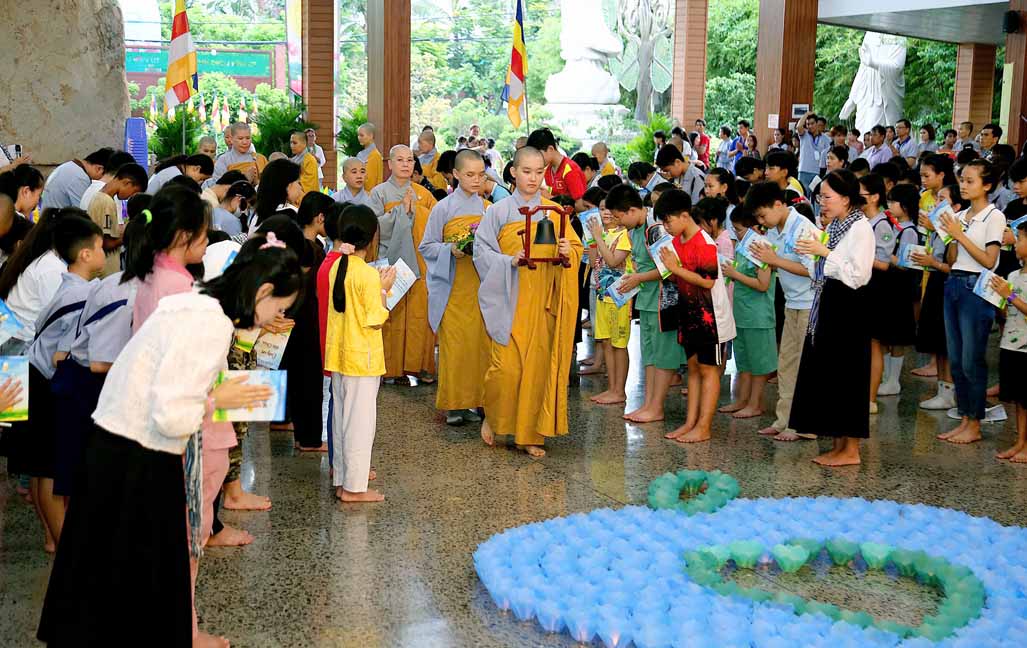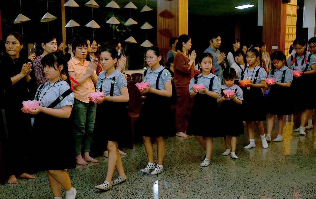 Chương trình được sự hướng dẫn của Ni sư Thích Diệu Hiếu cùng quý Sư cô tại Tu viện, các bé được tham dự nghi thức tụng kinh và thắp nến hoa đăng để gieo duyên lành với Phật pháp từ khi còn nhỏ.