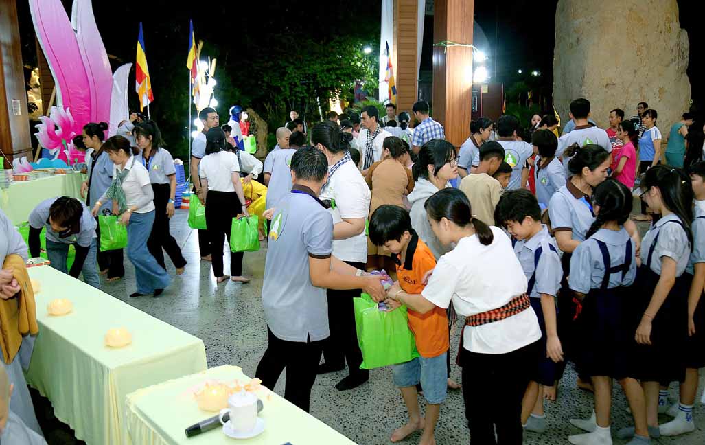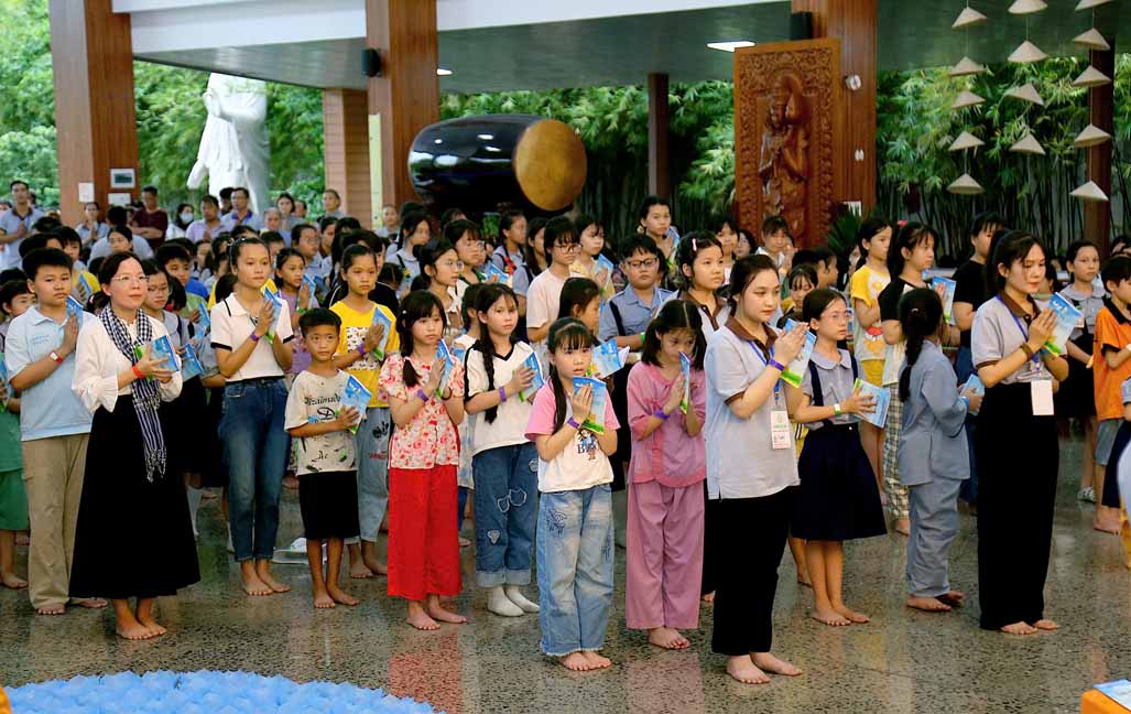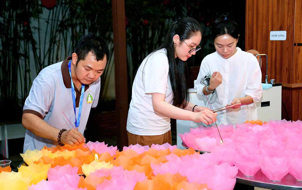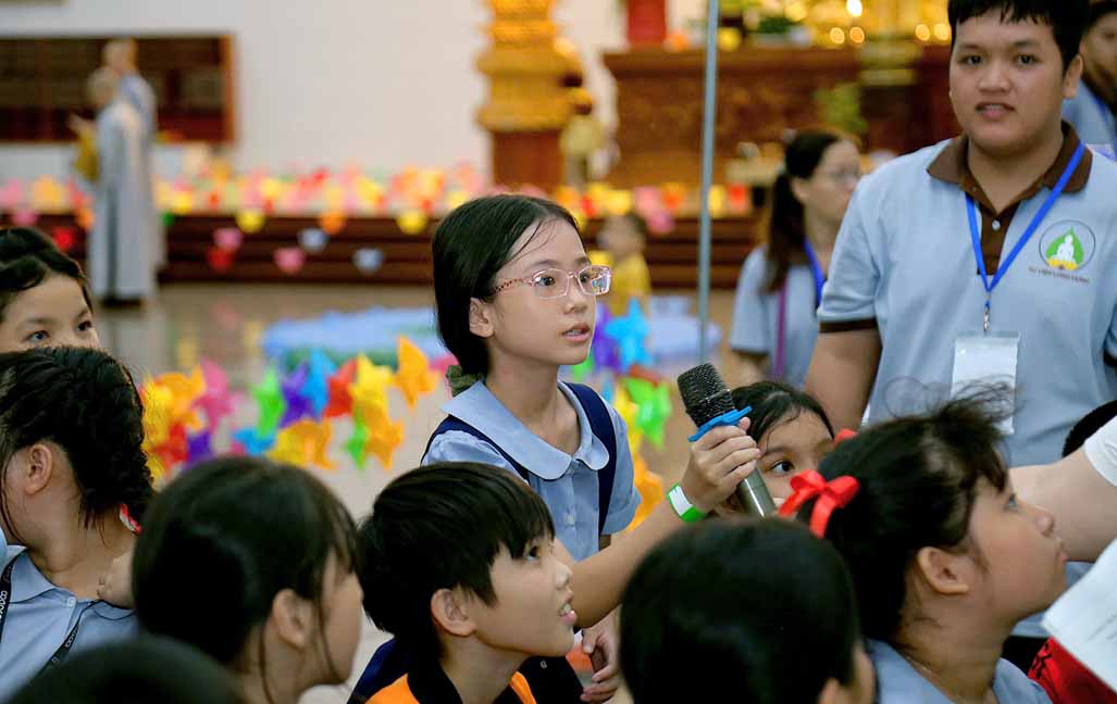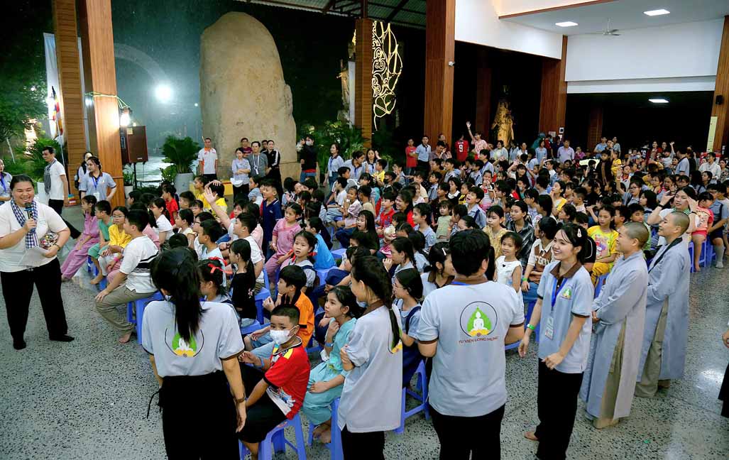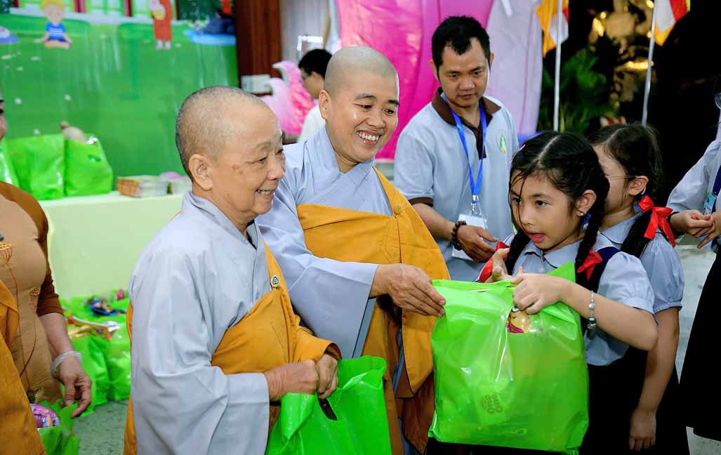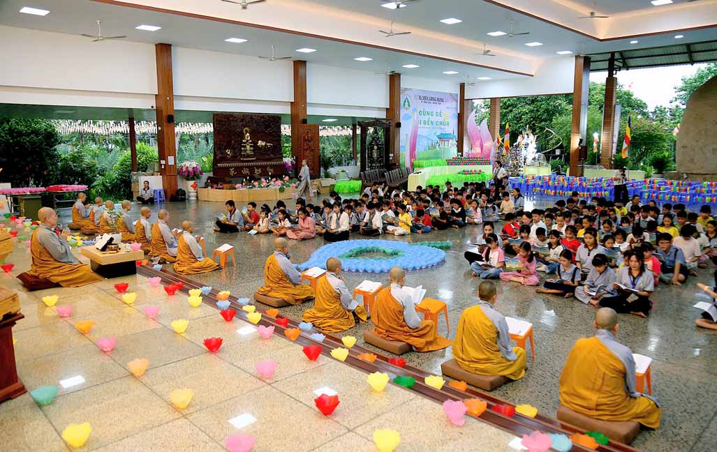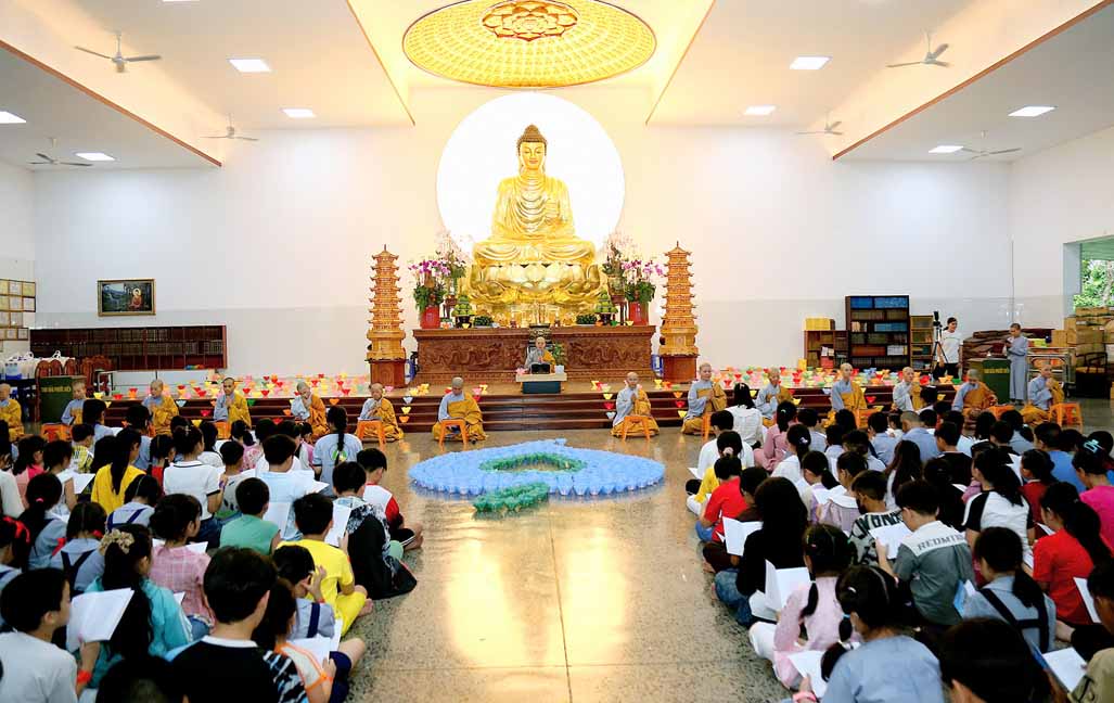 Chương trình được sự hướng dẫn của Ni sư Thích Diệu Hiếu cùng quý Sư cô tại Tu viện, các bé được tham dự nghi thức tụng kinh và thắp nến hoa đăng để gieo duyên lành với Phật pháp từ khi còn nhỏ.