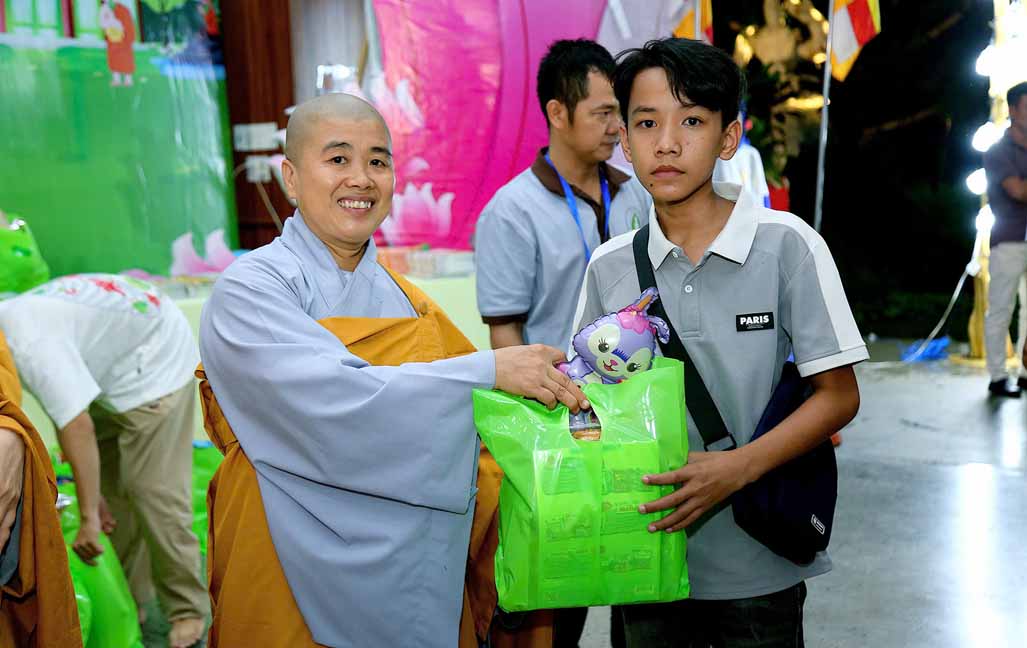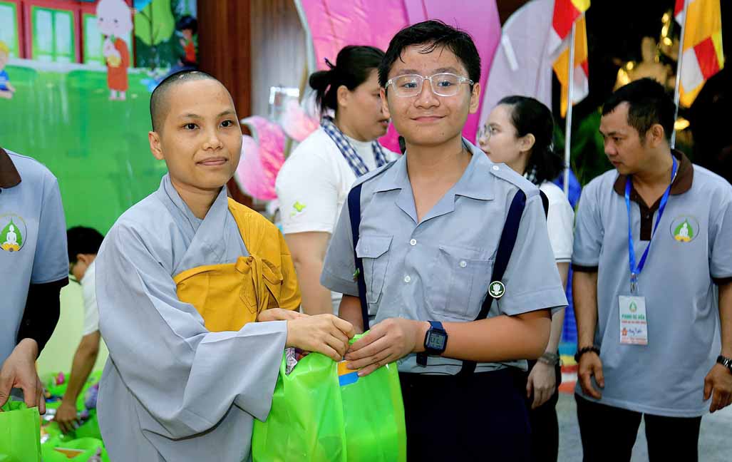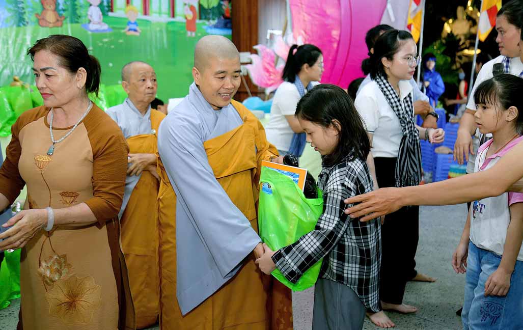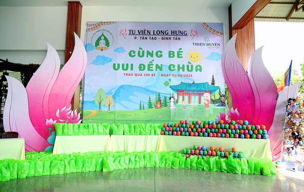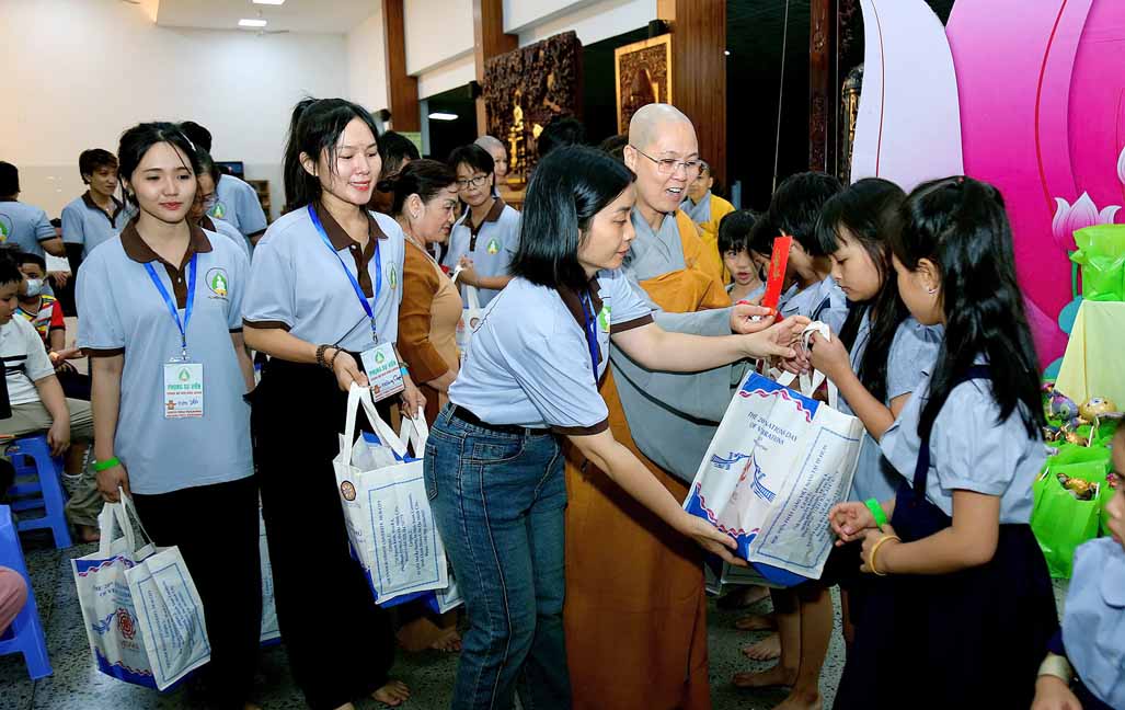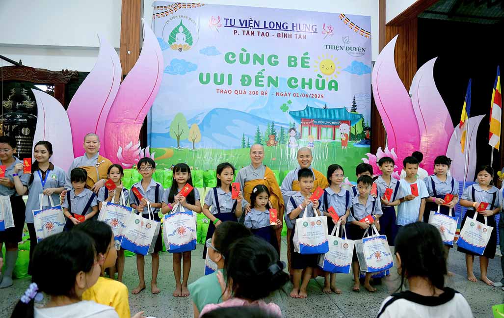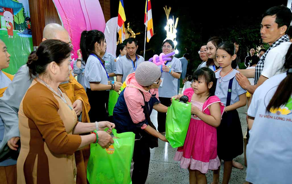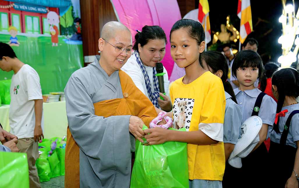 Đặc biệt, chú hề bong bóng với những tạo hình ngộ nghĩnh, đáng yêu đã mang lại nhiều tiếng cười và sự thích thú cho các bé. 20 em học sinh giỏi và xuất sắc đang sinh hoạt trong các nhóm Phụng sự viên và Gia đình Phật tử Long Hưng cũng được Ni sư tuyên dương, trao quà và phong bì trị giá gần 800 nghìn đồng /suất như lời động viên tinh tấn.