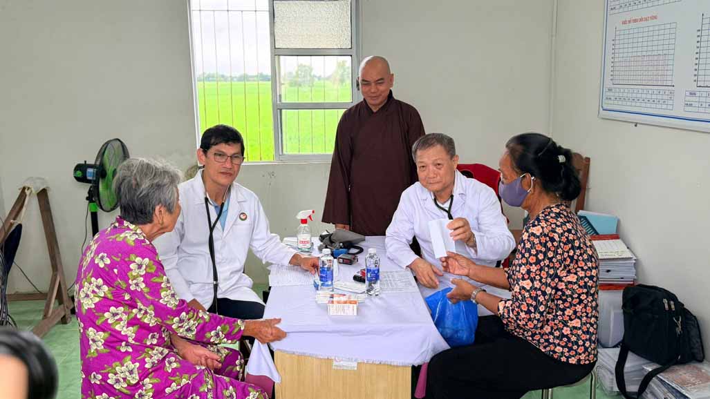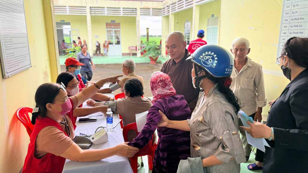 Tại trụ sở địa phương để hỗ trợ đăng ký, hướng dẫn và chăm sóc y tế cho bà con lớn tuổi. Đoàn thầy thuốc tình nguyện tiến hành: đo huyết áp, tư vấn sức khỏe, kê toa và phát thuốc miễn phí, hỗ trợ đặc biệt cho hơn 300 người già yếu.
