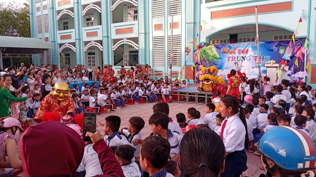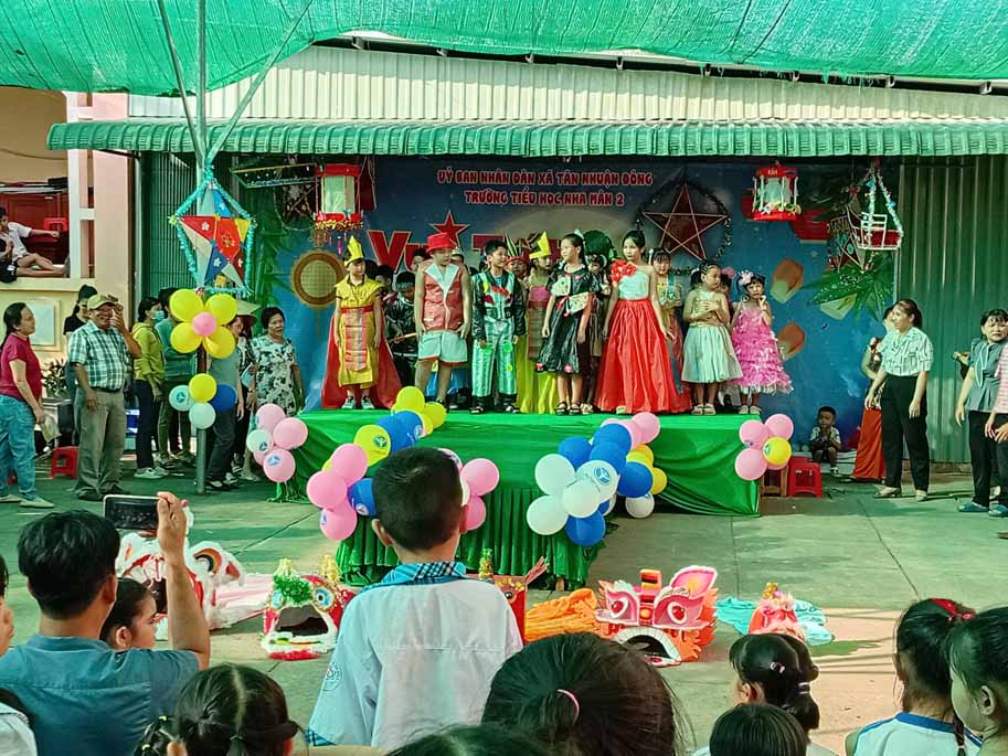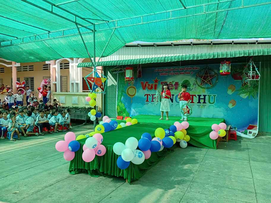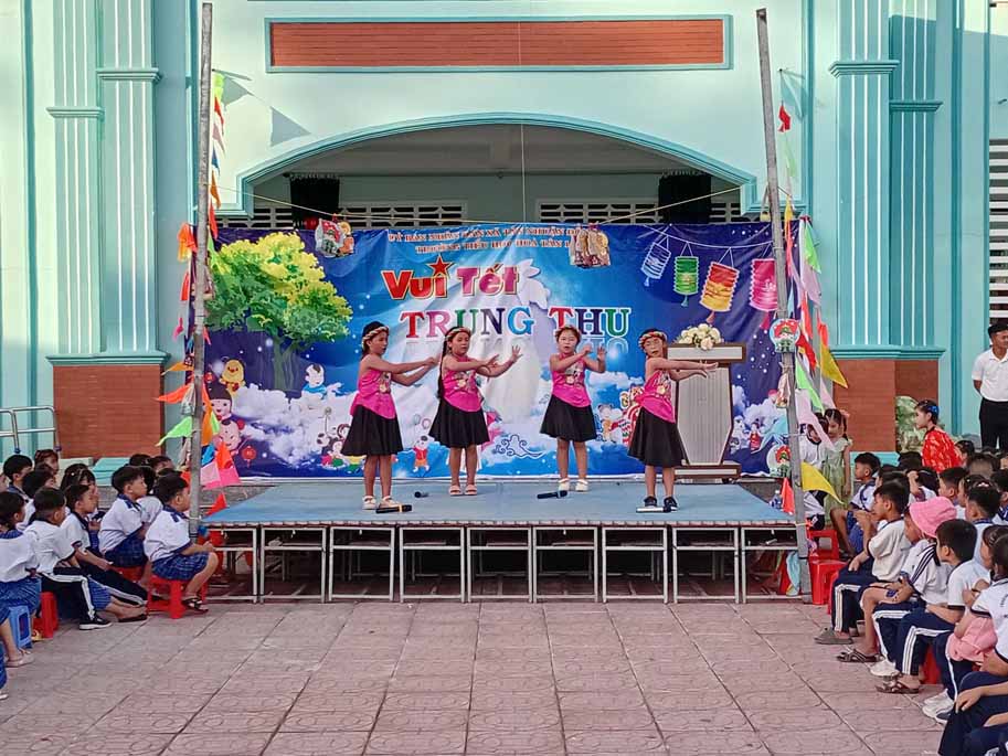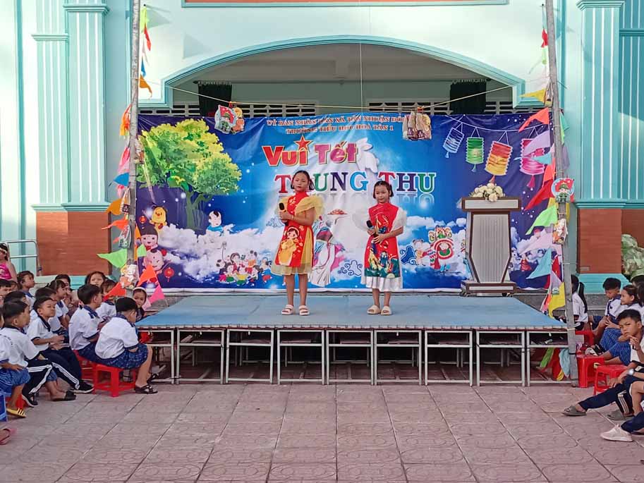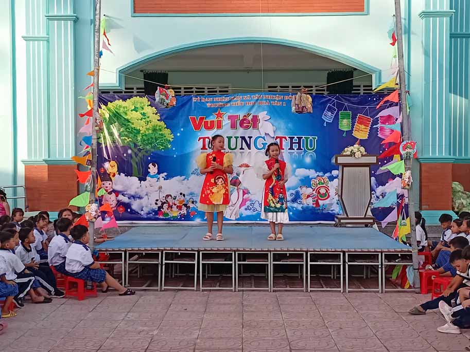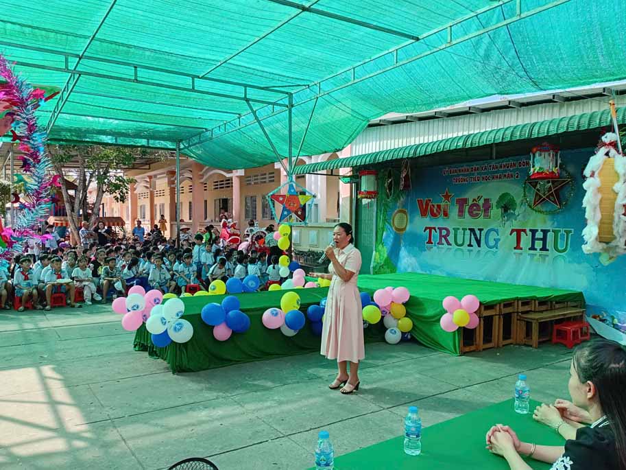 Đại diện BGH trường tiểu học, cô Nguyễn Trần Thanh Trúc – Hiệu trưởng trường tiểu học Nha Mân 2 và thầy Cao Hoàng Khải – Hiệu trưởng trường Tiểu học Hòa Tân 1, gửi lời chúc mừng nhân dịp Tết Trung thu, đồng thời chia sẻ về ý nghĩa của ngày Tết đoàn viên – dịp để gia đình sum họp, trẻ em được vui chơi, nhận quà và cảm nhận tình yêu thương của cộng đồng.