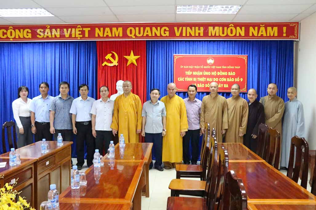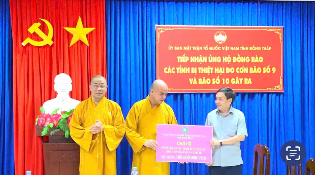 Ngày 16/ 10/ 2025, ban Trị sự GHPGVN tỉnh Đồng Tháp đã tổ chức đoàn đến điểm tiếp nhận của UBMTTQVN tỉnh để trao tiền ủng hộ đồng bào các tỉnh bị thiệt hại do bão số 9 và số 10. Tổng số tiền được trao là 100 triệu đồng.