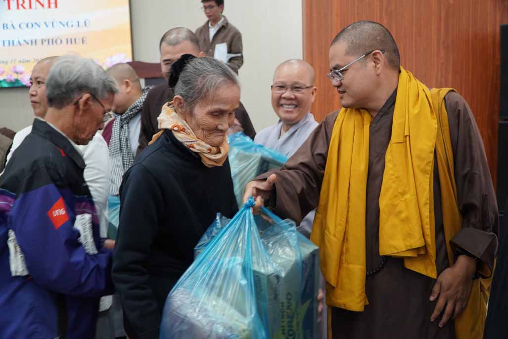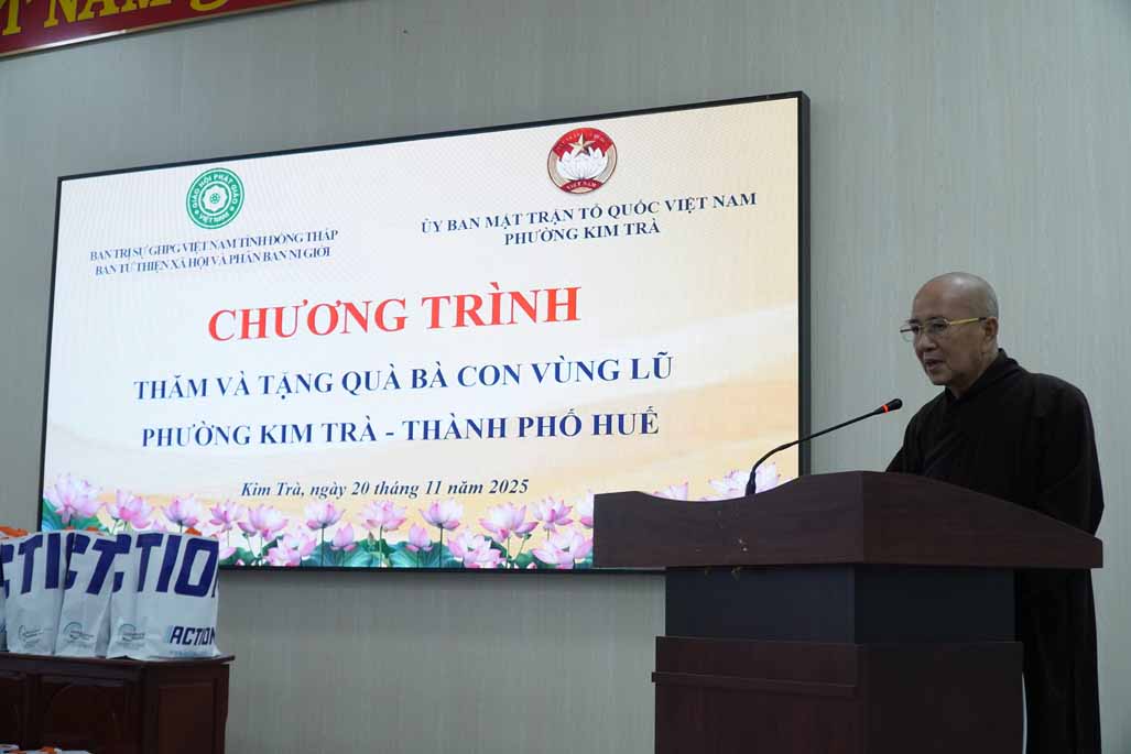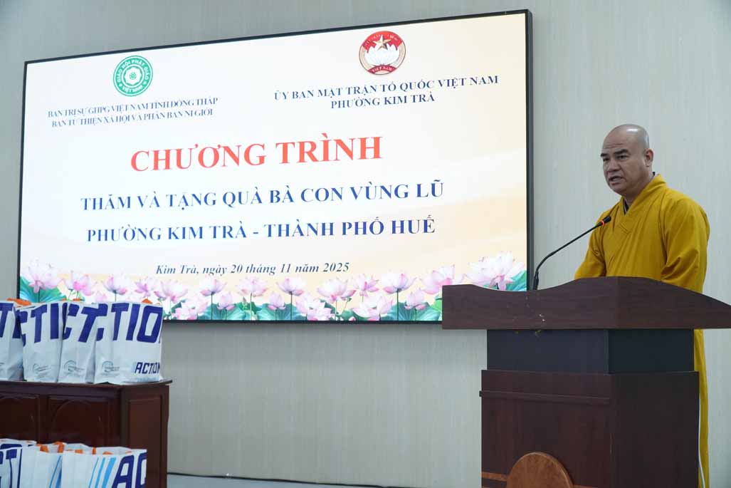 Trong lời phát biểu, Hòa thượng bày tỏ sự trân trọng đối với nghĩa cử của Phật giáo Đồng Tháp: “Giữa lúc bà con Huế còn nhiều khó khăn sau bão, sự có mặt của phái đoàn Đồng Tháp là nguồn động viên lớn lao. Đây là hình ảnh cao đẹp của tinh thần từ bi, chia sẻ của Tăng Ni và Phật tử phương Nam dành cho Huế. Thay mặt Giáo hội TP. Huế xin gửi lòng tri ân sâu sắc đến Chư Tôn đức và quý mạnh thường quân.”
