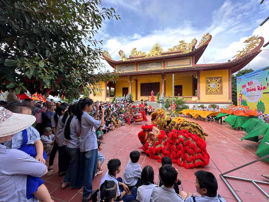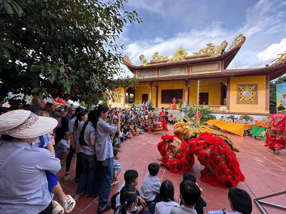 Ngay từ đầu giờ chiều, không khí tại sân chùa đã rộn ràng với tiếng trống múa lân sôi động, thu hút đông đảo các em nhỏ và phụ huynh. Những tiết mục vui nhộn từ chị Hằng, chú Cuội cùng nhiều trò chơi dân gian, đố vui đã mang đến tiếng cười hồn nhiên, tạo nên bầu không khí Trung thu ấm áp và tràn đầy sắc màu tuổi thơ.