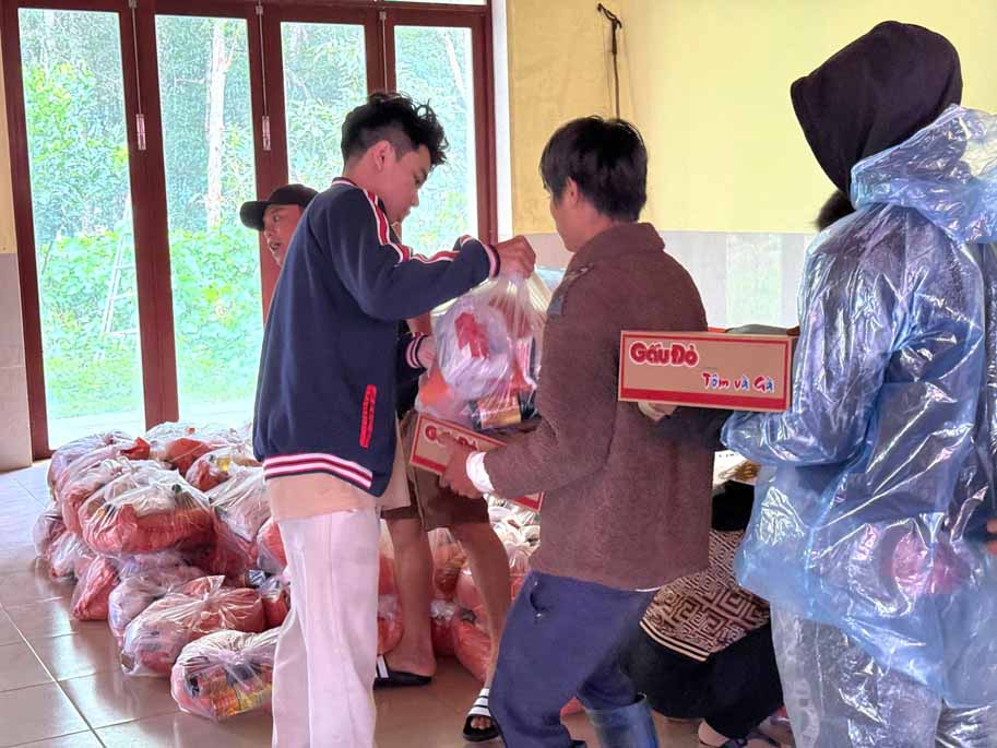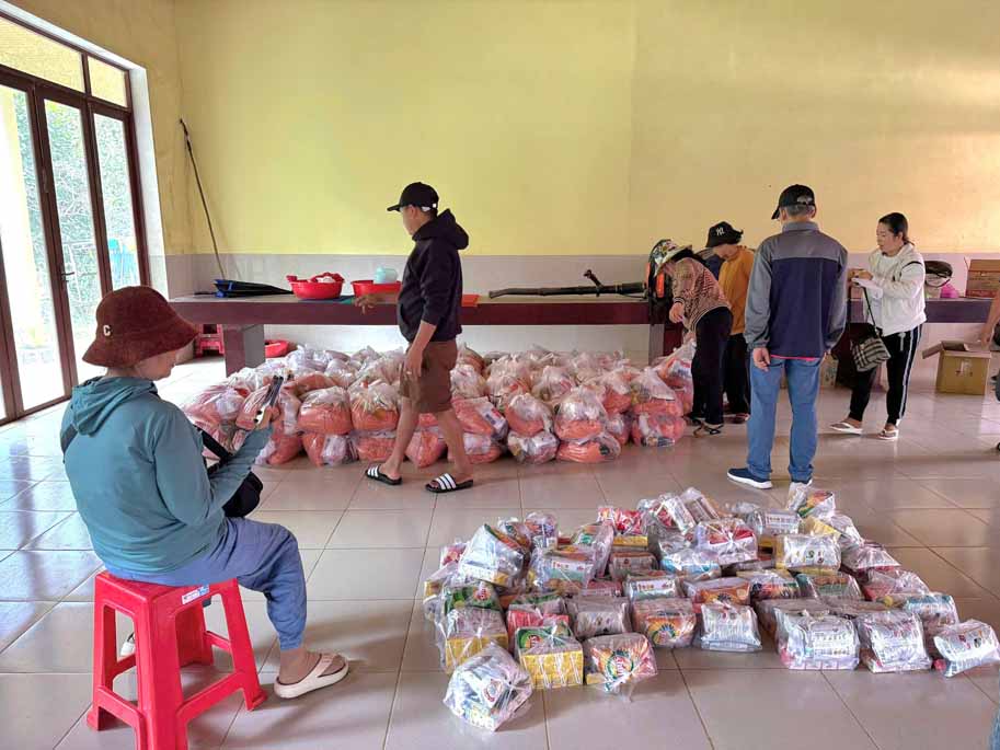 Các phần quà được đóng gói cẩn thận, bao gồm những nhu yếu phẩm thiết yếu để ổn định cuộc sống sau lũ gồm 10 kg gạo, mì tôm, dầu ăn, đường, bánh, quần áo và tiền mặt 200 nghin đồng.