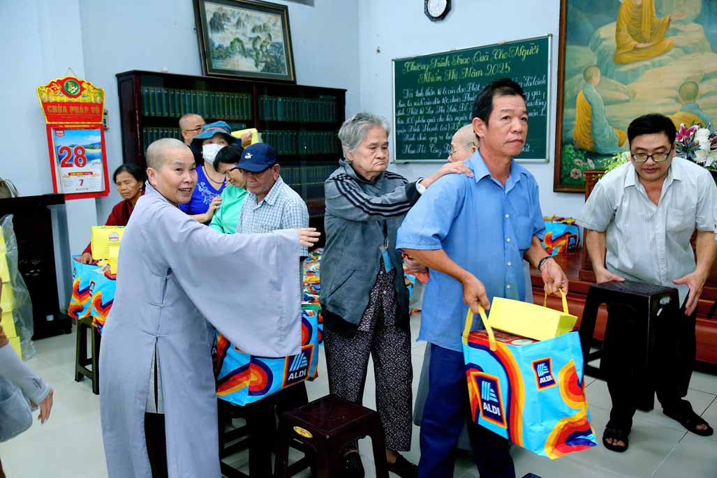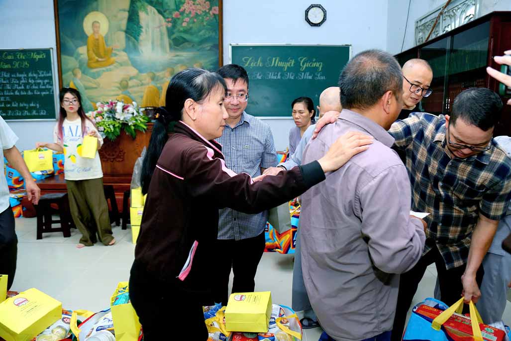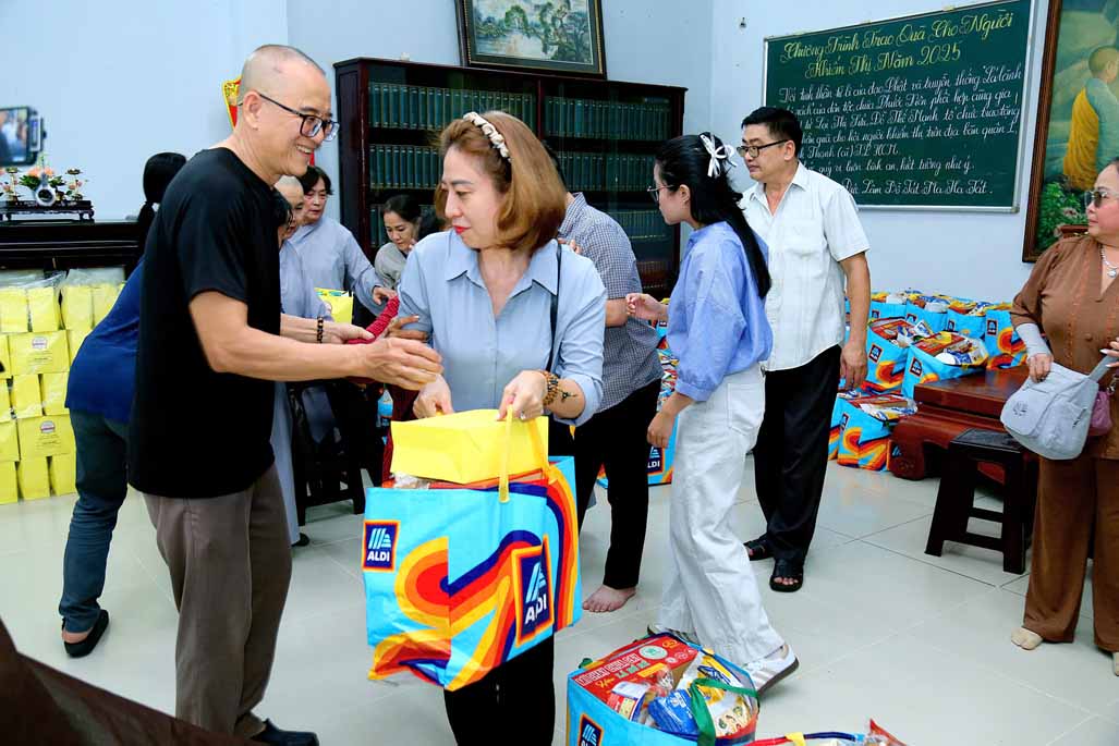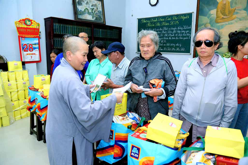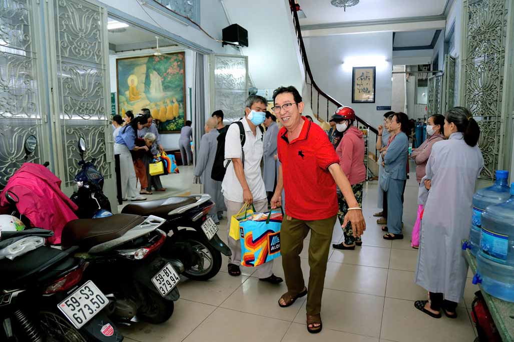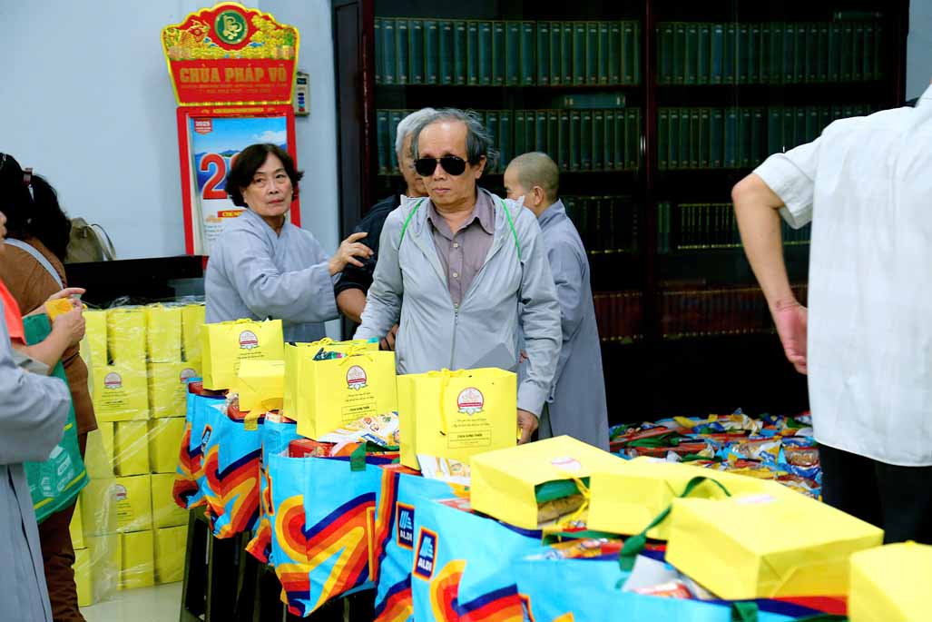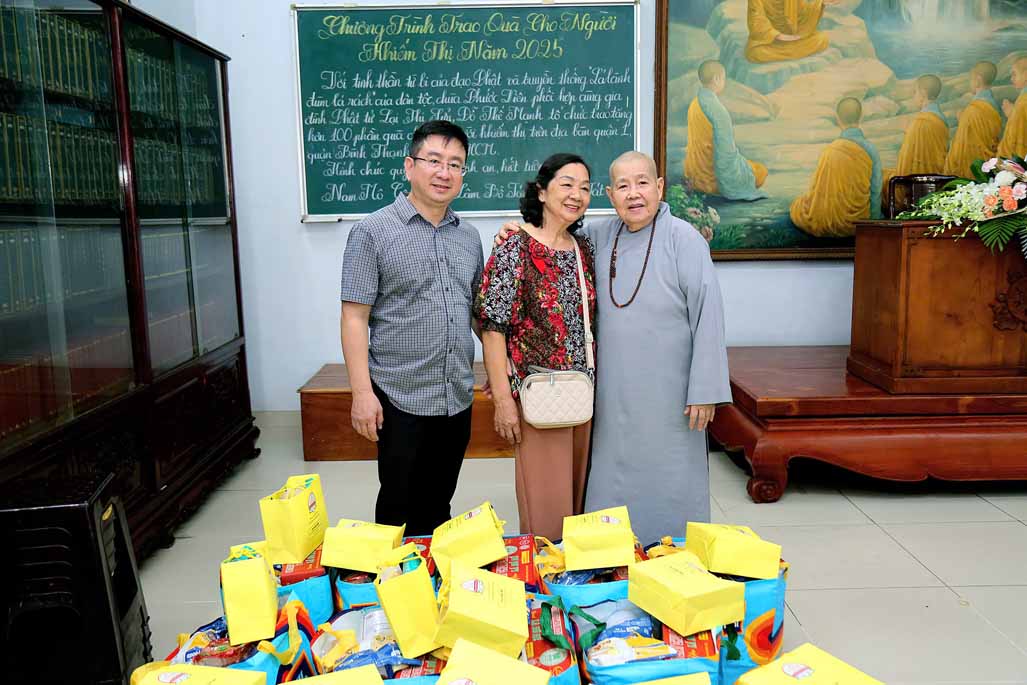 Điều xúc động nhất là niềm hoan hỷ rạng ngời của bà con khiếm thị. Mỗi phần quà gồm 10 ký gạo, 1 thùng mì, chai nước tương, 1 ký bột nêm, cháo và bao thư 100 nghìn đồng cùng với phần quà từ Ni sư Thích Như Lan (chùa Hưng Thiền) cũng chung tay trao tặng.