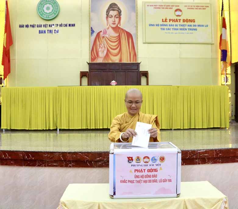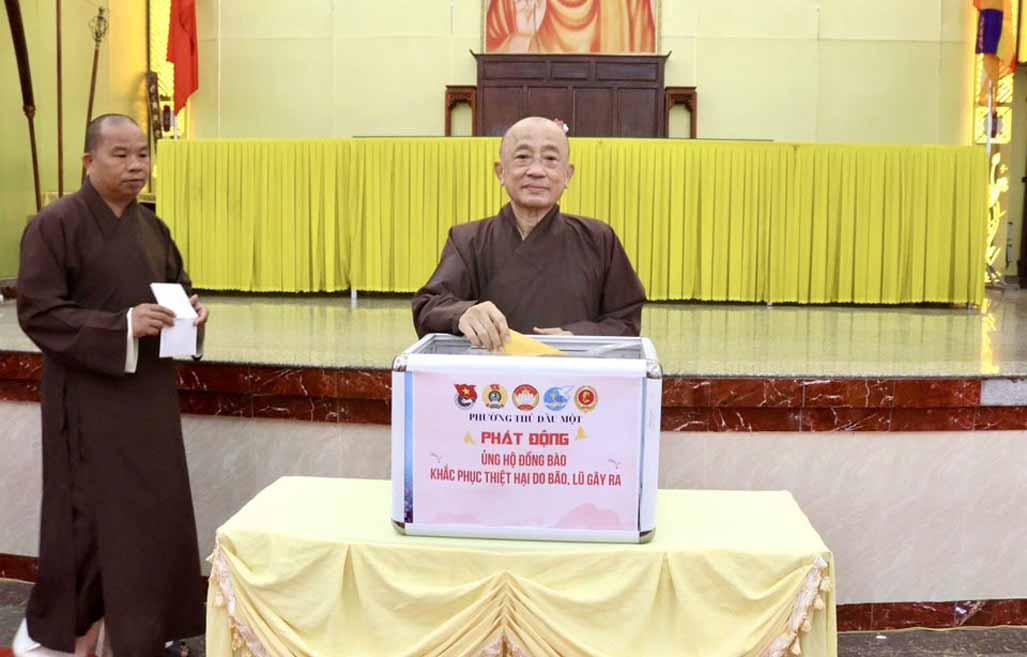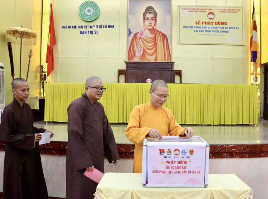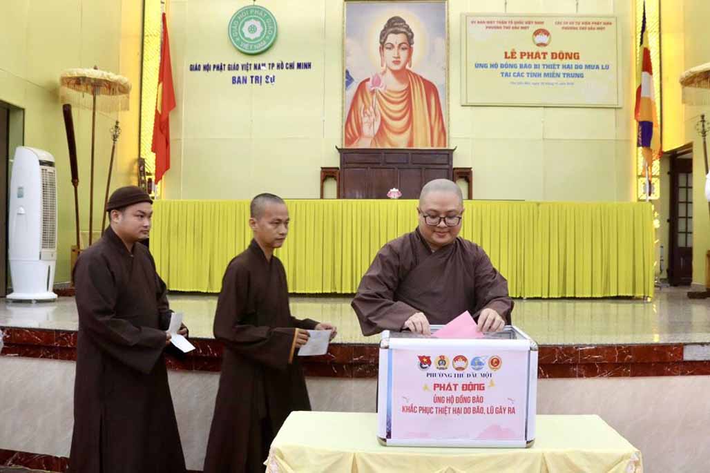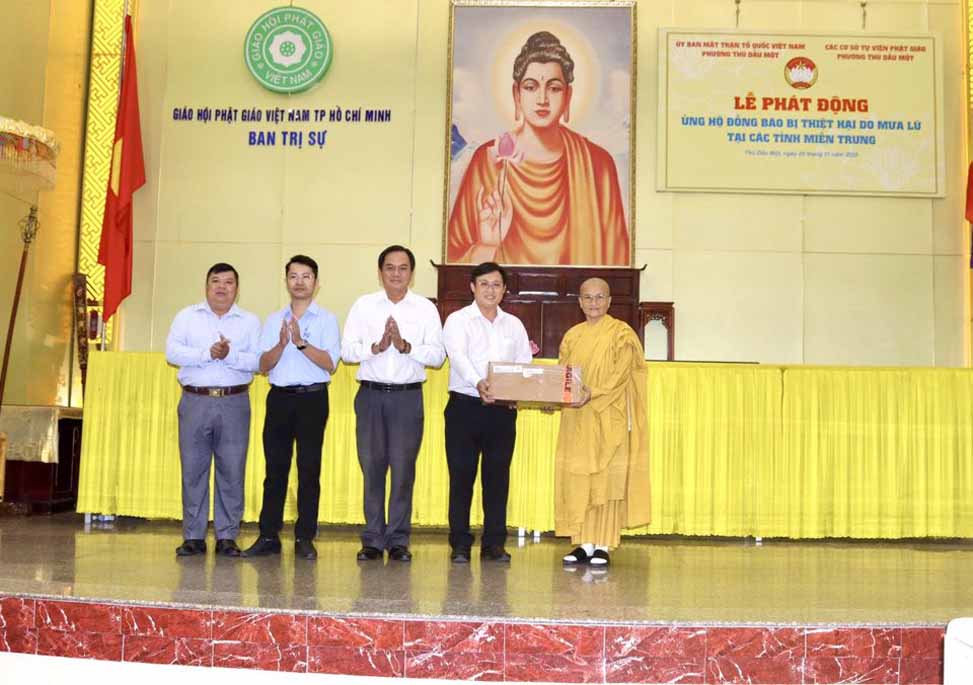 Được biết trước đó, theo báo cáo từ Văn phòng Ban Trị sự TP.Hồ Chí Minh, khu vực Bình Dương (cũ) thì từ khi hay tin bà con miền Trung bị thiệt hại nặng nề trong các đợt bão lũ, chư Tôn đức Tăng Ni trụ trì các tự viện thuộc khu vực Bình Dương (cũ) đã vận động tịnh tài, nhu yếu phẩm, thuốc men đến tận nơi chia sẻ những khó khăn hiện tại của người dân nơi đây, với tổng trị giá gần 25 tỷ đồng, với mong muốn tiếp thêm nguồn động lực giúp bà con vượt qua khó khăn, sớm ổn định lại cuộc sống.