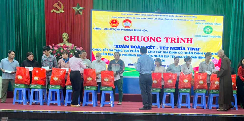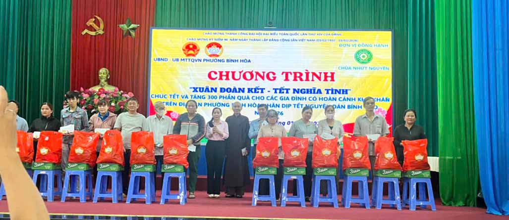 Nhân dịp tết cổ truyền Bính Ngọ đang đến gần, để cho bà con nghèo tại địa phương có một cái Tết đầm ấm hơn, TT. Thích Thiện Hỷ – Ủy viên Ban Trị sự GHPGVN thành phố Hồ Chí Minh, Trụ trì Nhứt Nguyên Bửu tự (P.Bình Hòa) đã Quân phối hợp với chính quyền địa phương trao tặng 350 phần quà nghĩa tình đón Xuân Bính Ngọ – 2026 đến với bà con có hoàn cảnh khó khăn trong cuộc sống tại Trung tâm Văn hoá Thể dục Thể thao Cộng đồng phường Bình Hoà vào ngày 31/01/2026.