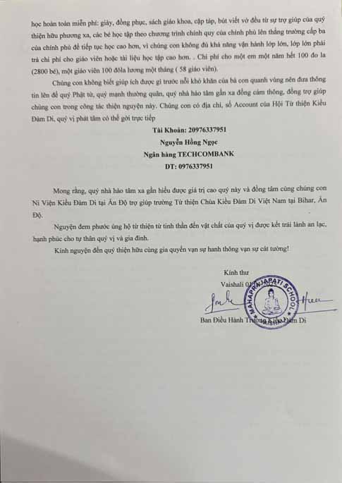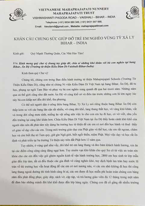 Chúng tôi, chúng con trong Ban điều hành trường từ thiện Mahaprajapati Schools (Trường Từ Thiện Kiều Đàm Di), cũng như Ni chúng Ni viện Kiều Đàm Di Việt Nam tại bang Bihar, Ấn Độ, đã tu học, phụng sự ngôi Tam Bảo và phục vụ bà con nghèo xung quanh đã qua hai mươi năm. Những năm qua, cả thế giới cũng như đất nước Ấn Độ vô cùng khổ sở và điêu tàn trước những cơn lũ lớn ngay lúc này bà con khắp nơi đều đói khổ, tha phương.