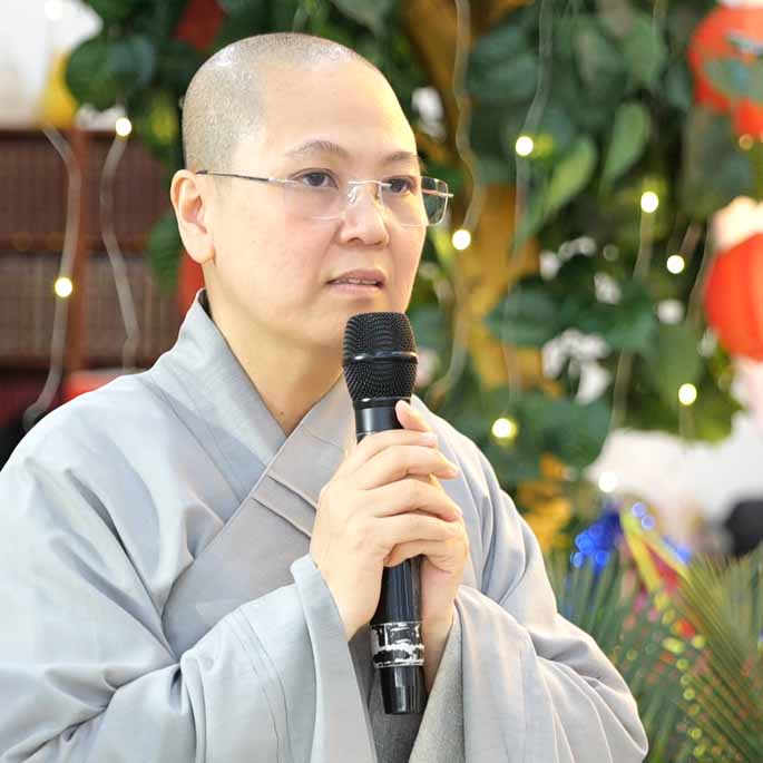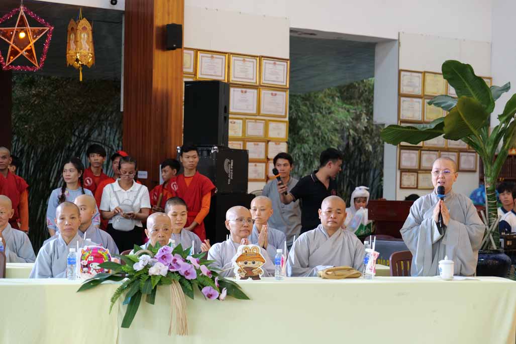 Mở đầu buổi lễ, Ni sư Thích Diệu Hiếu chia sẻ: Hôm nay, trong không khí hân hoan của ngày Tết Trung thu – Tết của tình thân, của đoàn viên, chúng ta cùng nhau sum họp nơi đây để dành cho các cháu thiếu nhi một ngày hội thật ý nghĩa. Đây là dịp để các cháu được vui chơi, ca hát, đón nhận tình thương và sự quan tâm từ gia đình, quý chính quyền, cũng như từ chư Ni trong tinh thần từ bi của đạo Phật. Qua những hoạt động hôm nay, chúng ta mong muốn gieo vào tâm hồn các cháu những hạt giống thiện lành, để tình thương và lòng hiếu thảo được nuôi lớn từng ngày. Đồng thời, đây cũng là dịp nuôi dưỡng lòng biết ơn đối với cha mẹ, thầy cô và Tam Bảo – những người đã dạy dỗ, chở che và soi sáng con đường trưởng thành cho các cháu. Chúng tôi tin tưởng rằng, với sự chăm lo và định hướng đúng đắn, các cháu sẽ luôn là con ngoan, trò giỏi, trở thành những mầm non tươi sáng cho tương lai của đất nước. Việc tổ chức chương trình hôm nay không chỉ mang lại niềm vui cho các em nhỏ, mà còn góp phần duy trì và phát huy những giá trị tốt đẹp của lễ hội truyền thống văn hoá dân tộc Việt Nam.