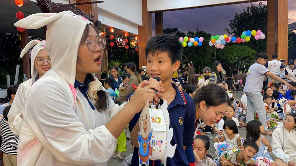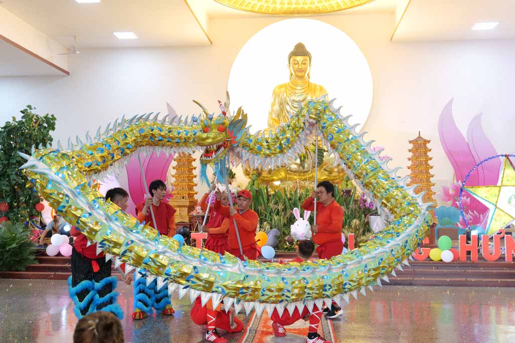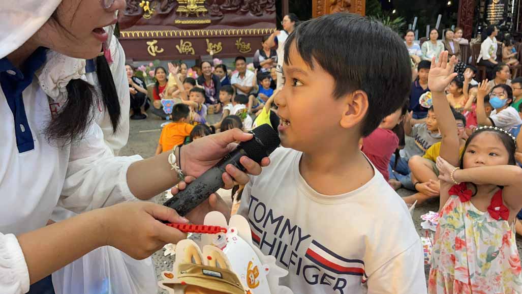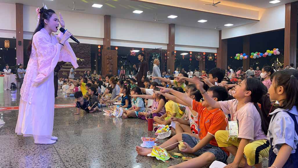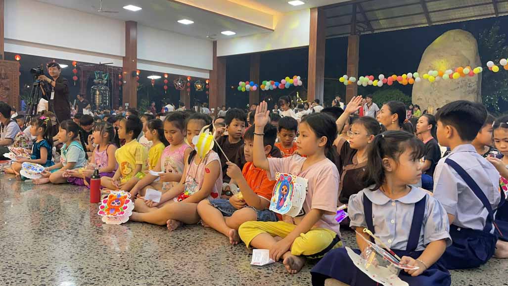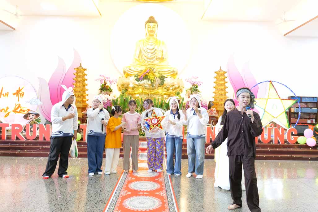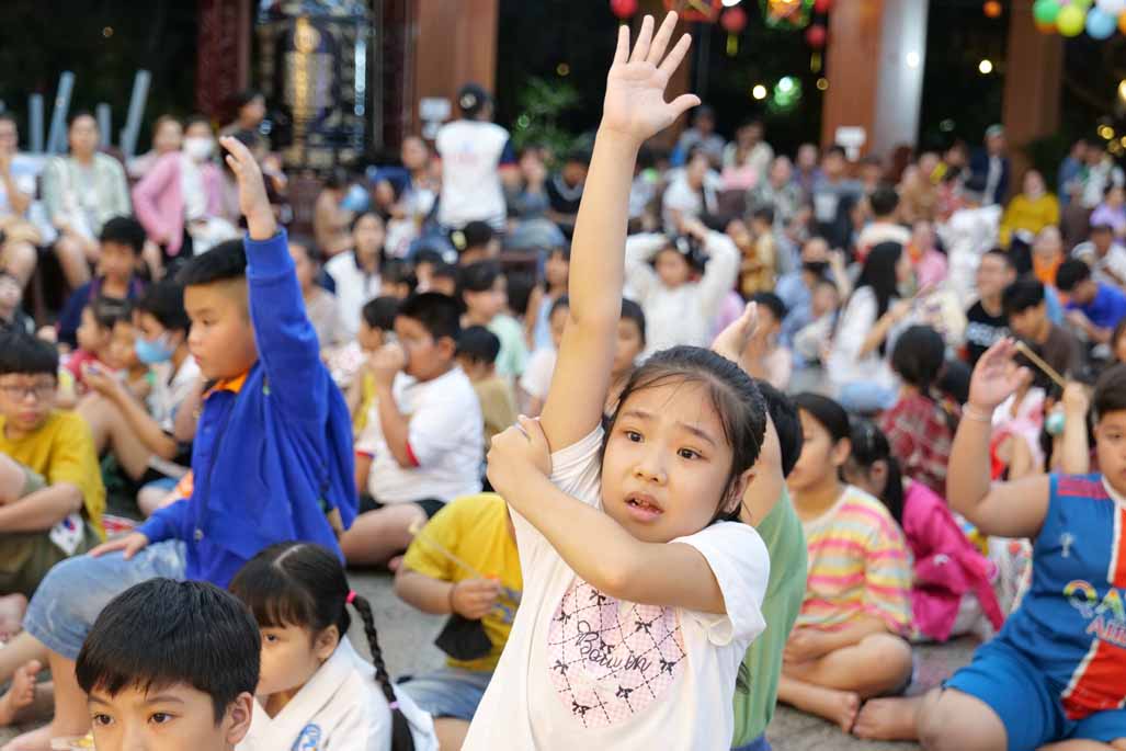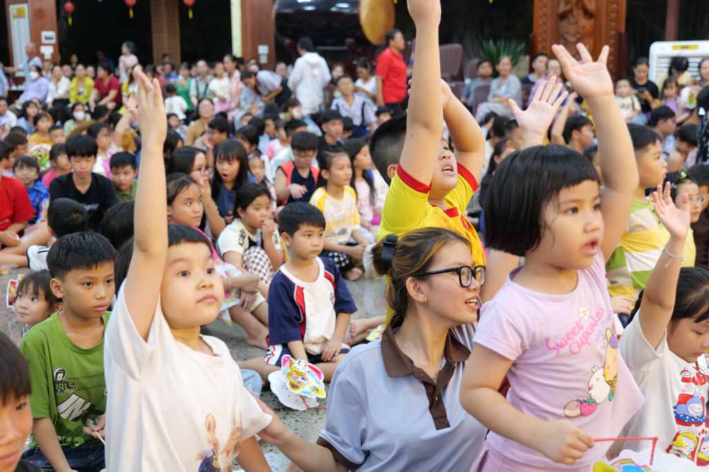 Các em nhỏ còn được tham gia trò chơi đố vui, múa hát, trình diễn thời trang lồng đèn do Gia đình Phật tử Long Hưng hướng dẫn. Niềm vui hồn nhiên, tiếng cười rộn ràng hòa cùng ánh sáng lung linh của hàng trăm ngọn đèn, tạo nên bức tranh Trung Thu đầy màu nhiệm.