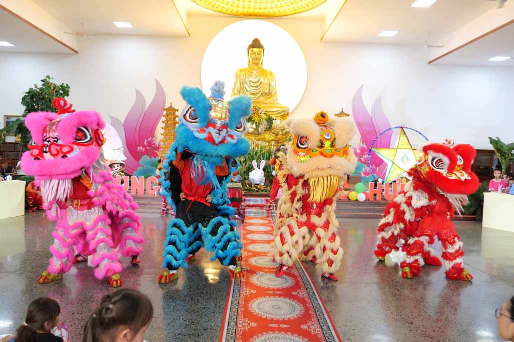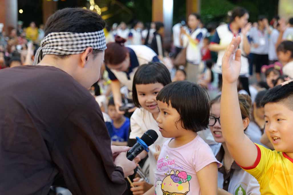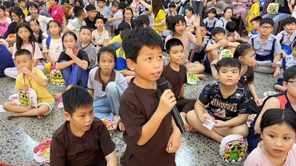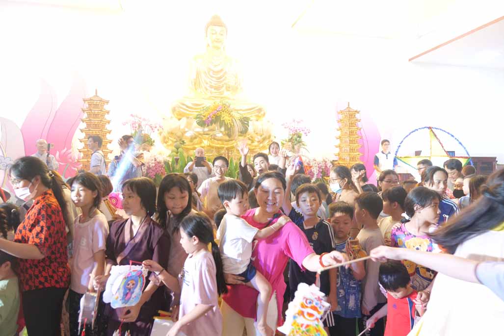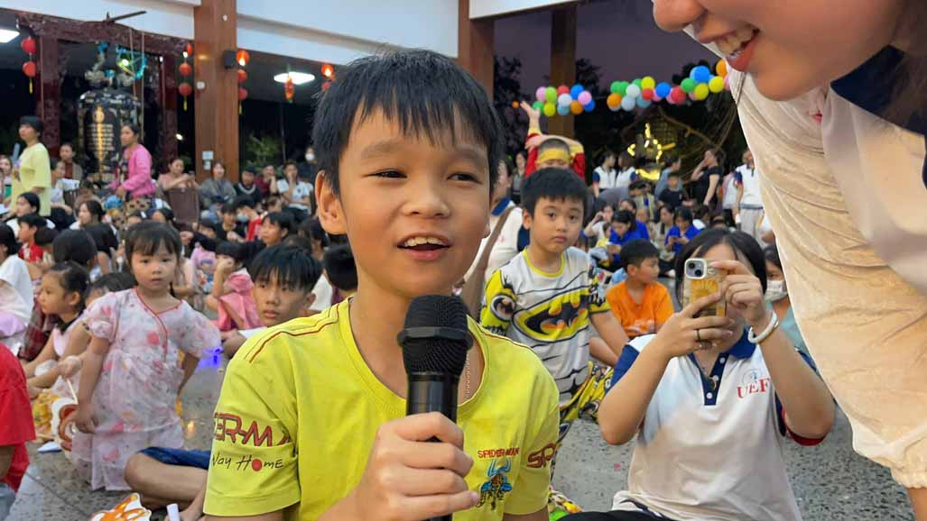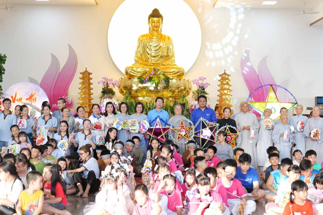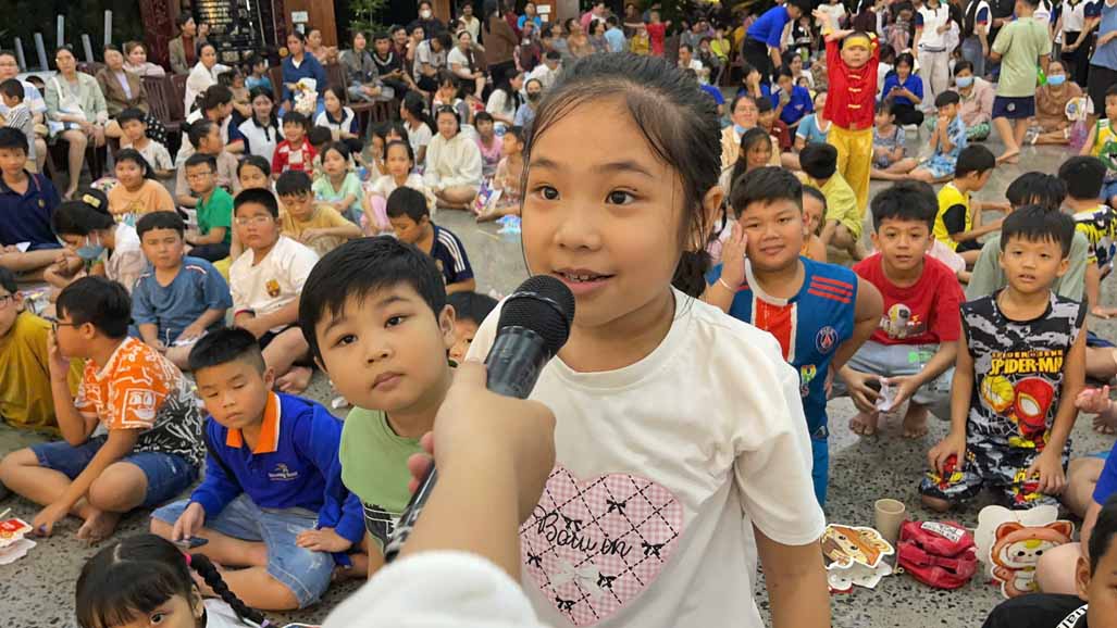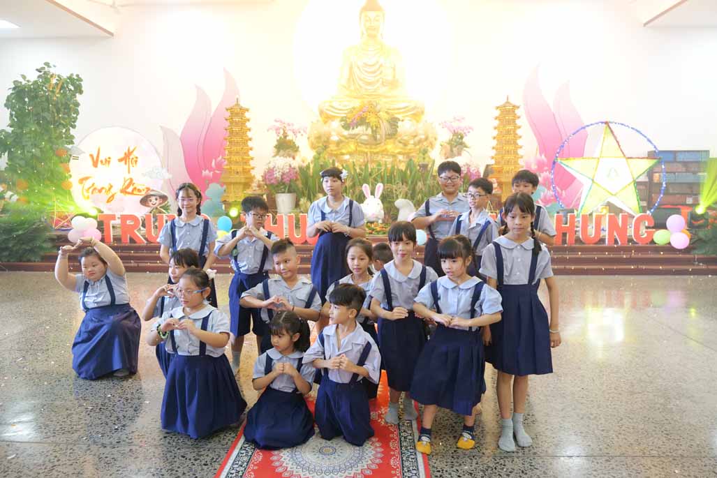 Các em nhỏ còn được tham gia trò chơi đố vui, múa hát, trình diễn thời trang lồng đèn do Gia đình Phật tử Long Hưng hướng dẫn. Niềm vui hồn nhiên, tiếng cười rộn ràng hòa cùng ánh sáng lung linh của hàng trăm ngọn đèn, tạo nên bức tranh Trung Thu đầy màu nhiệm.