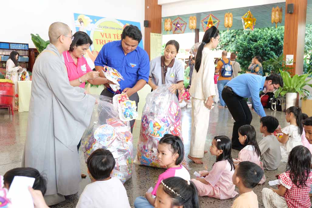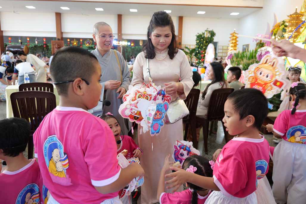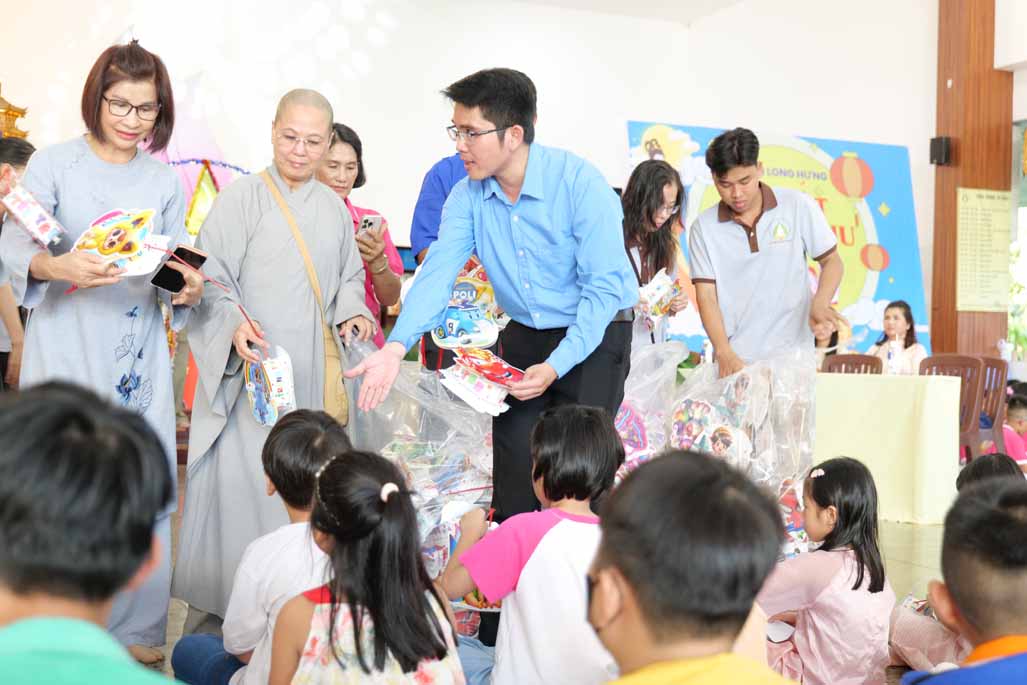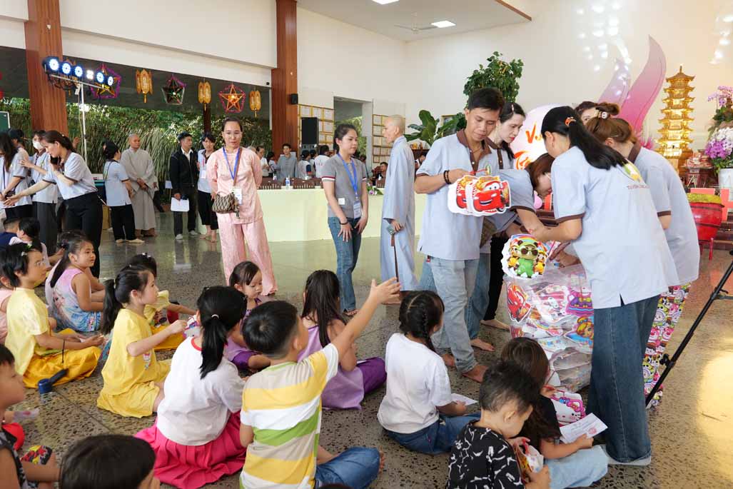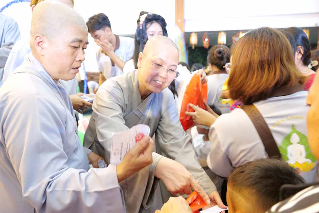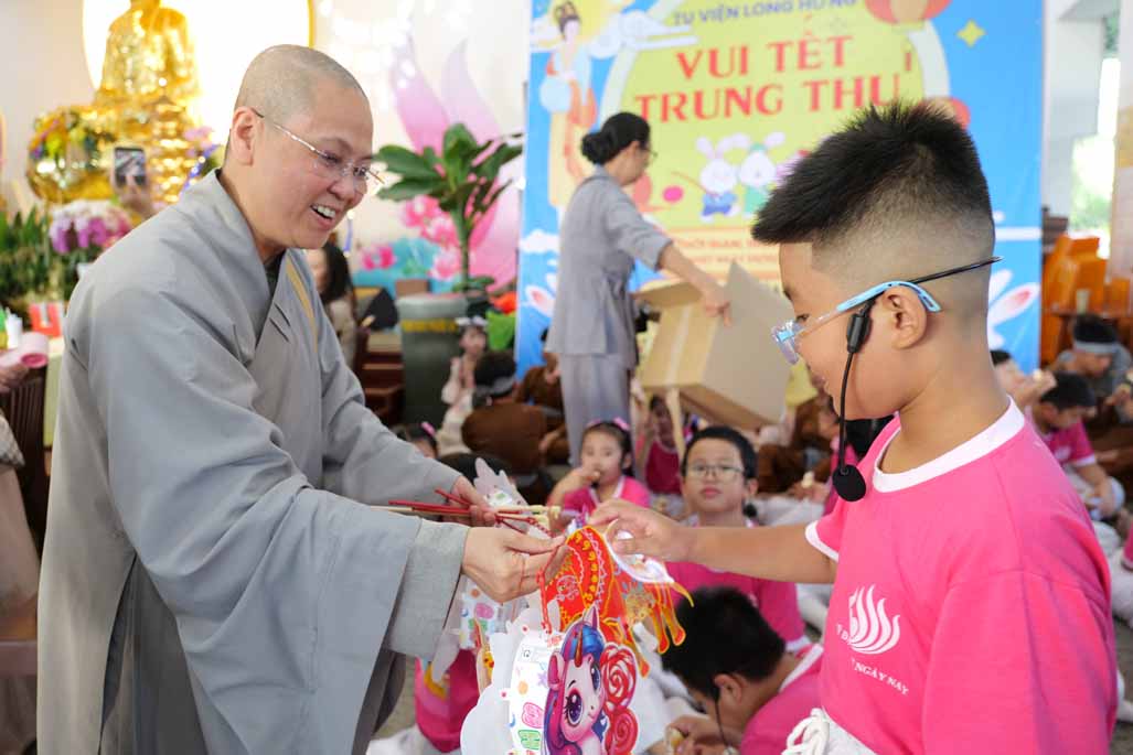 Phần được mong chờ nhất là trao quà Trung Thu cho hơn 1000 em thiếu nhi. Những phần quà gồm bánh, kẹo, sữa, lồng đèn và phong bao lì xì nhỏ được Ni sư Diệu Hiếu, chư Ni cùng Phật tử Tu viện Long Hưng trao tận tay cho từng em, kèm lời chúc: An lành – Học giỏi – Ngoan hiền.