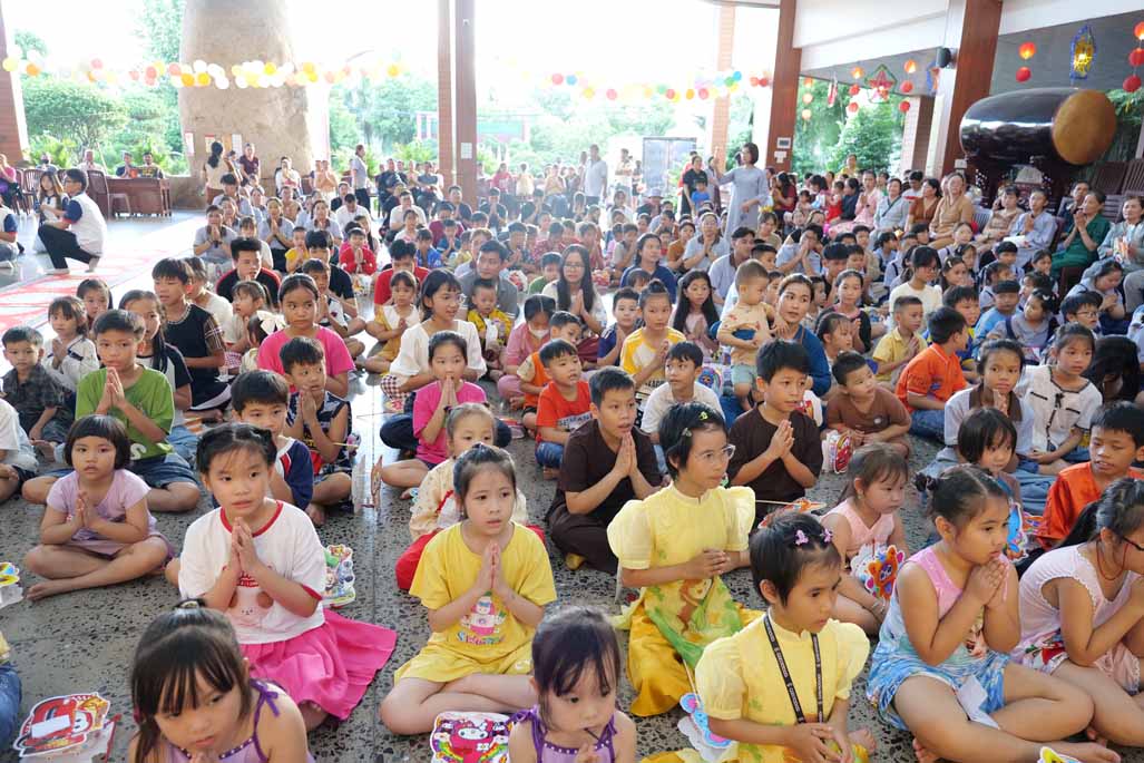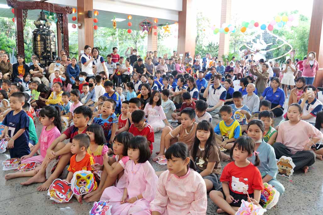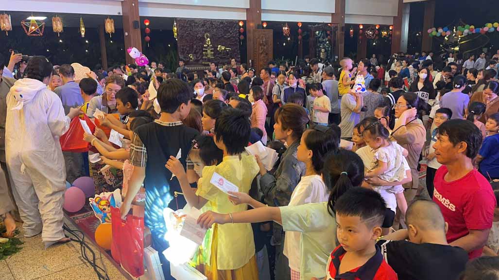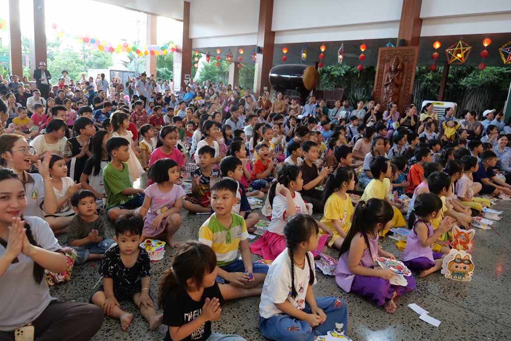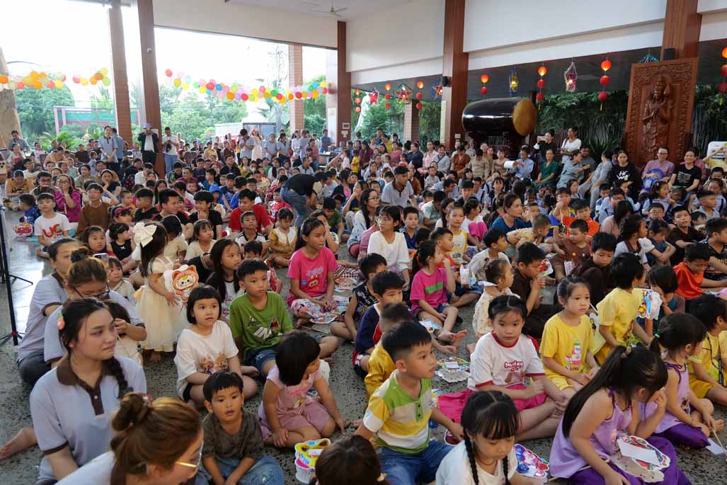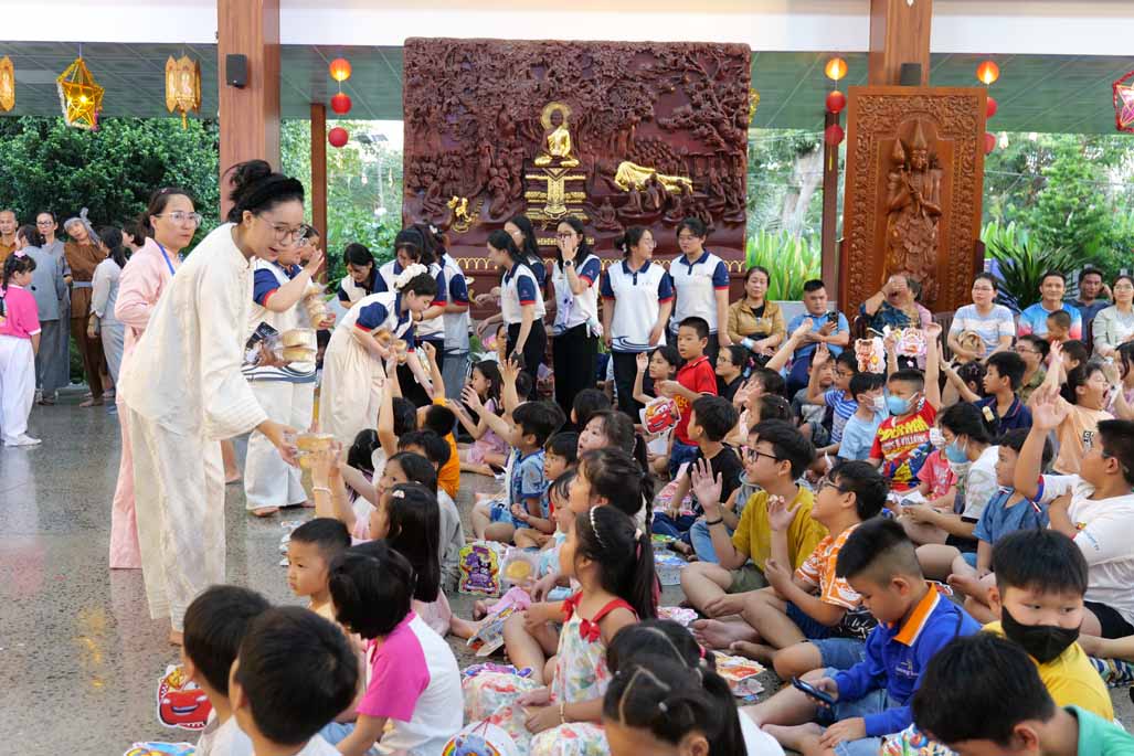 Phần được mong chờ nhất là trao quà Trung Thu cho hơn 1000 em thiếu nhi. Những phần quà gồm bánh, kẹo, sữa, lồng đèn và phong bao lì xì nhỏ được Ni sư Diệu Hiếu, chư Ni cùng Phật tử Tu viện Long Hưng trao tận tay cho từng em, kèm lời chúc: An lành – Học giỏi – Ngoan hiền.