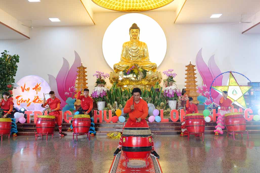 Không khí chương trình được khuấy động bằng màn trống hội Trung Thu hoành tráng, mở đầu cho tiết mục múa lân – sư – rồng đầy sắc màu. Tiếng trống dồn dập vang vọng trong đại điện như lời chúc bình an, may mắn gửi đến tất cả mọi người.