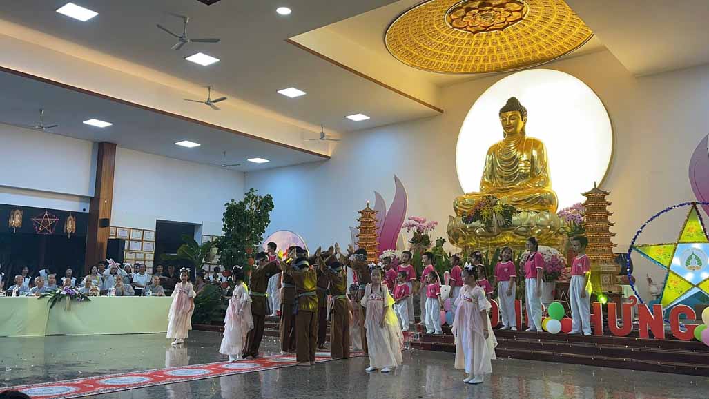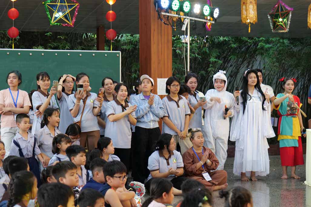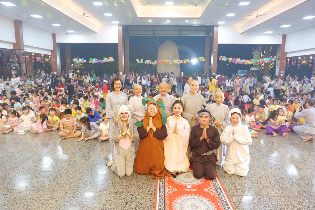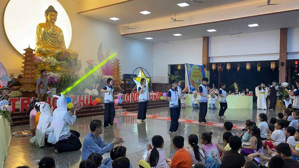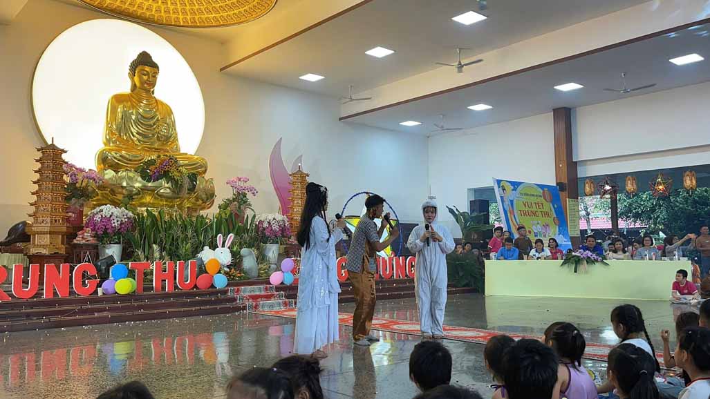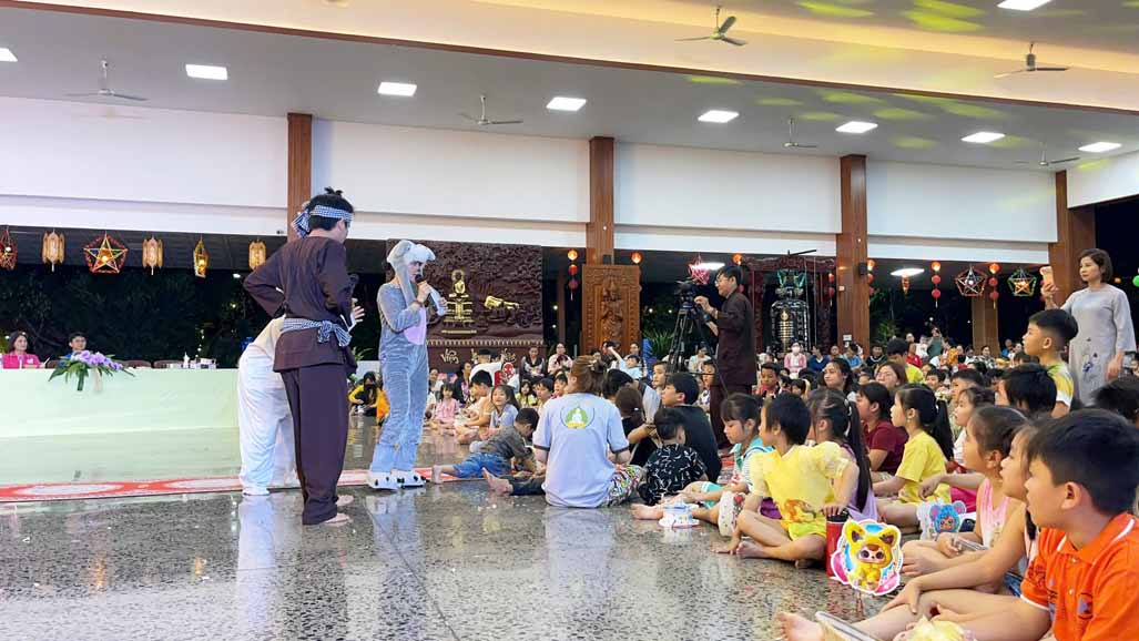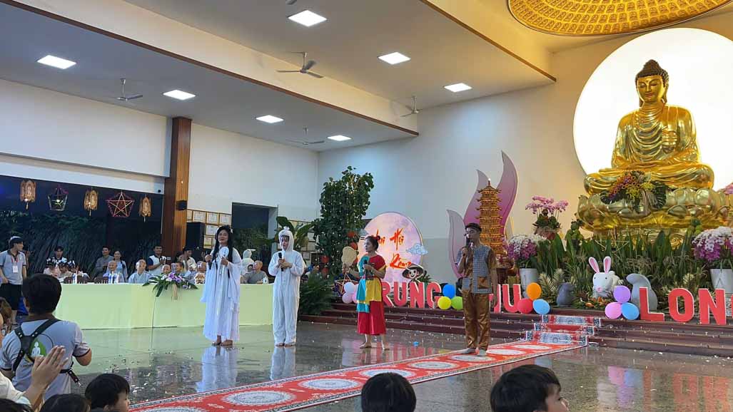 Tiếp nối là tiết mục hoạt cảnh “Sự tích chú Cuội – chị Hằng” do nhóm Phụng sự viên Tu viện Long Hưng biểu diễn, mang lại tiếng cười sảng khoái và những tràng pháo tay nồng nhiệt.