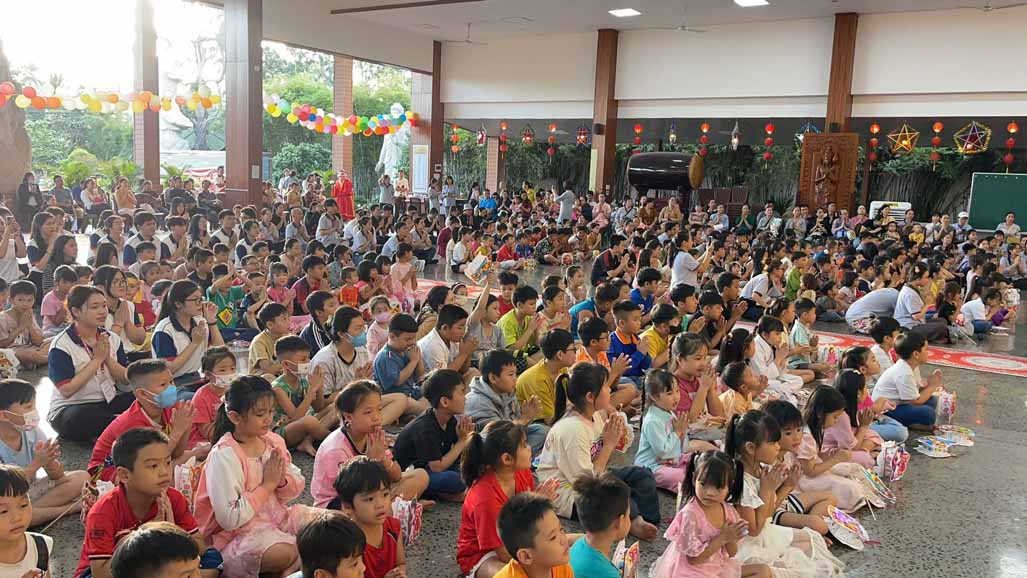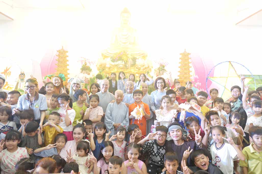 Ánh mắt trẻ thơ rạng rỡ niềm vui, những nụ cười trong veo như phản chiếu ánh trăng hiền từ trên tôn tượng Đức Phật. Sau phần trao quà, toàn thể đại chúng cùng các em đi kinh hành niệm Phật quanh khuôn viên chánh điện Tu viện, thắp lên những ngọn nến lung linh tưởng niệm và tri ân – như biểu tượng của lòng biết ơn và ánh sáng giác ngộ.